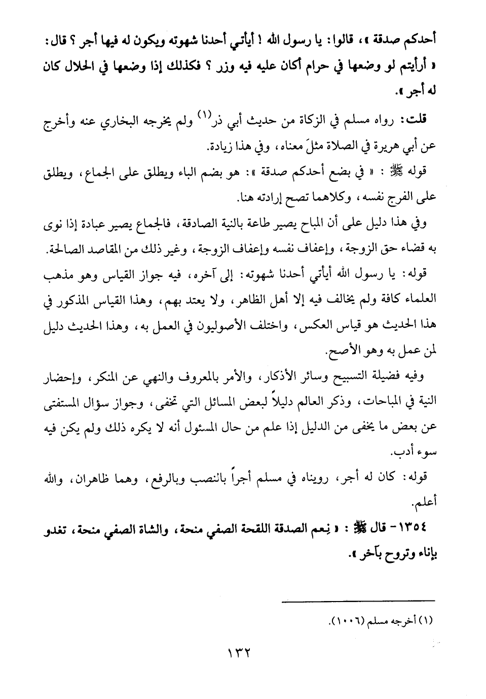 أحدكم صدقة"، قالوا: يا رسول الله! أيأتي أحدنا شهوته ويكون له فيها أجر؟ قال: "أرأيتم لو وضعها في حرام أكان عليه فيه وزر؟ فكذلك إذا وضعها في الحلال كان له أجر".