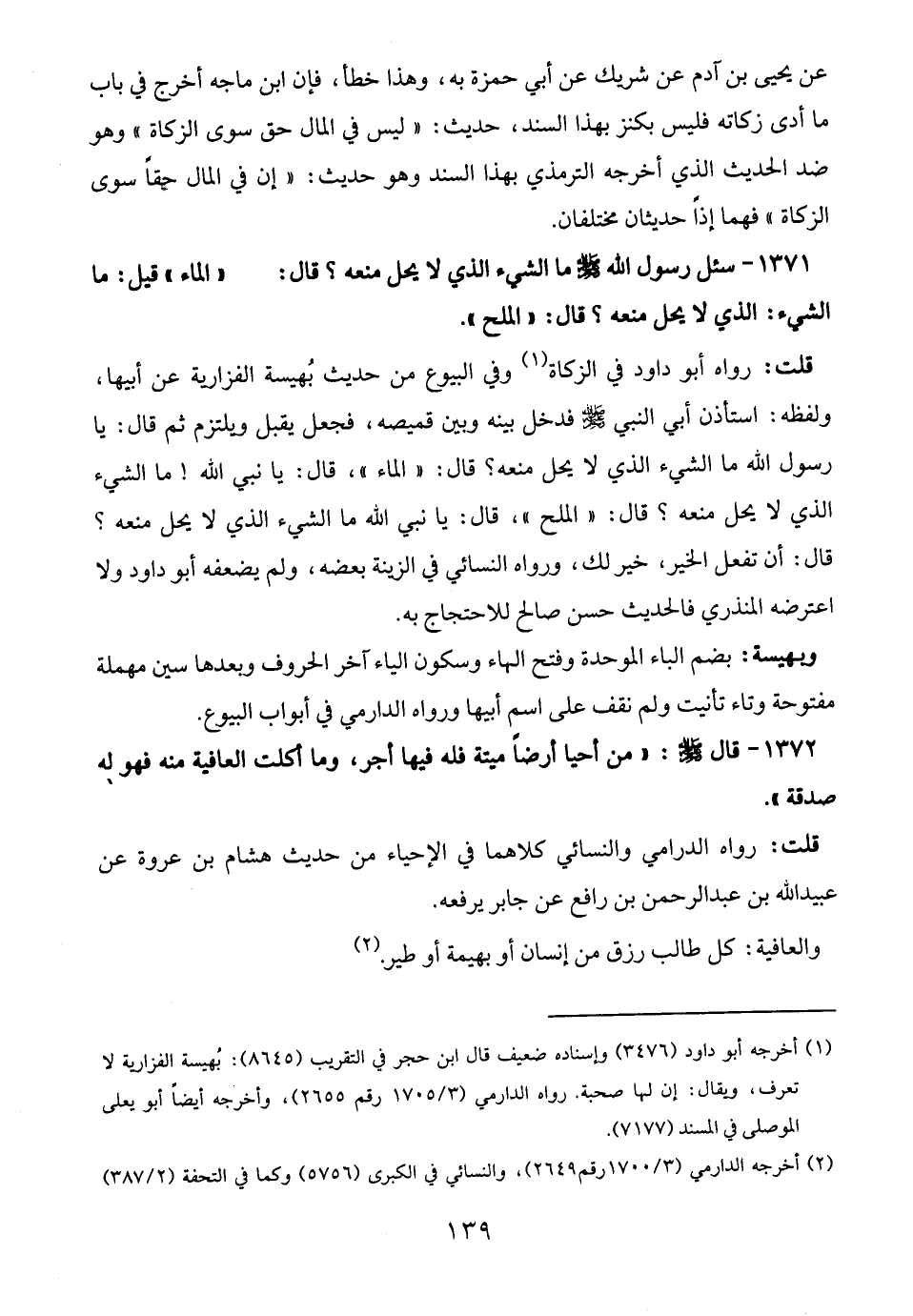 1371 - سئل رسول الله -صلى الله عليه وسلم- ما الشيء الذي لا يحل منعه؟ قال: "الماء، قيل: ما الشيء: الذي لا يحل منعه؟ قال: "الملح".