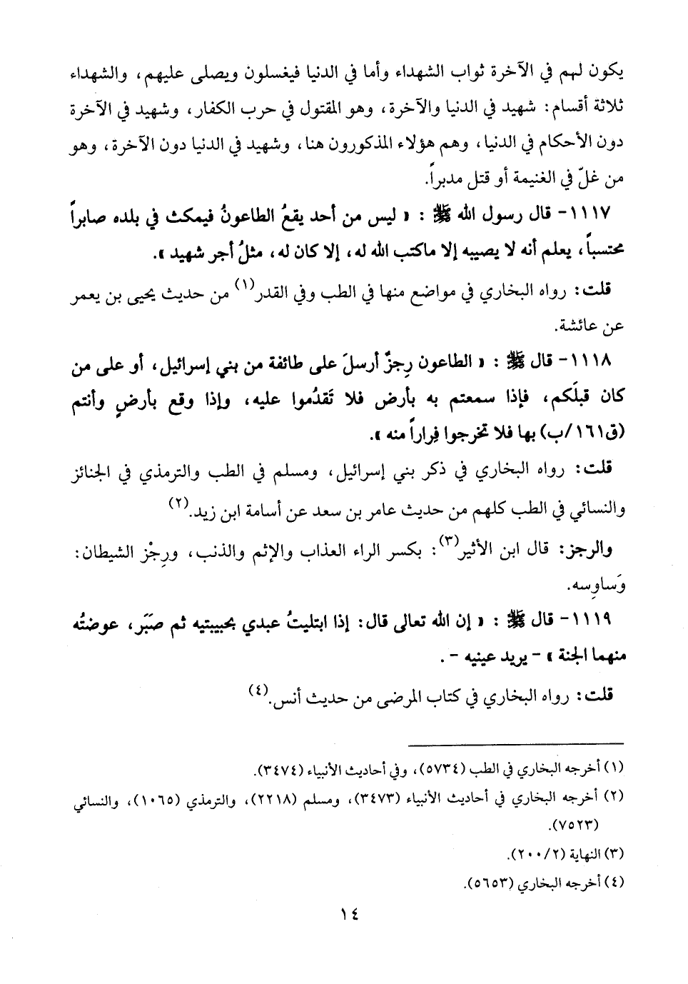 1118 - قال - صلى الله عليه وسلم -: "الطاعون رِجزٌ أرسلَ على طائفة من بني إسرائيل، أو على من كان قبلَكم، فإذا سمعتم به بأرض فلا تَقدُموا عليه، وإذا وقع بأرضٍ وأنتم بها فلا تخرجوا فِرارًا منه".