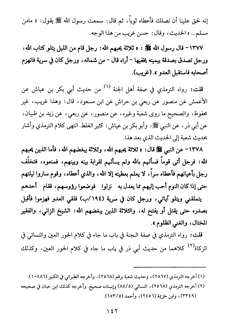 1377 - قال رسول الله -صلى الله عليه وسلم-: "ثلاثة يحبهم الله: رجل قام من الليل يتلو كتاب الله، ورجل تصدق بصدقة بيمينه يخفيها -أراه قال- من شماله، ورجل كان في سرية فانهزم أصحابه فاستقبل العدو". (غريب).