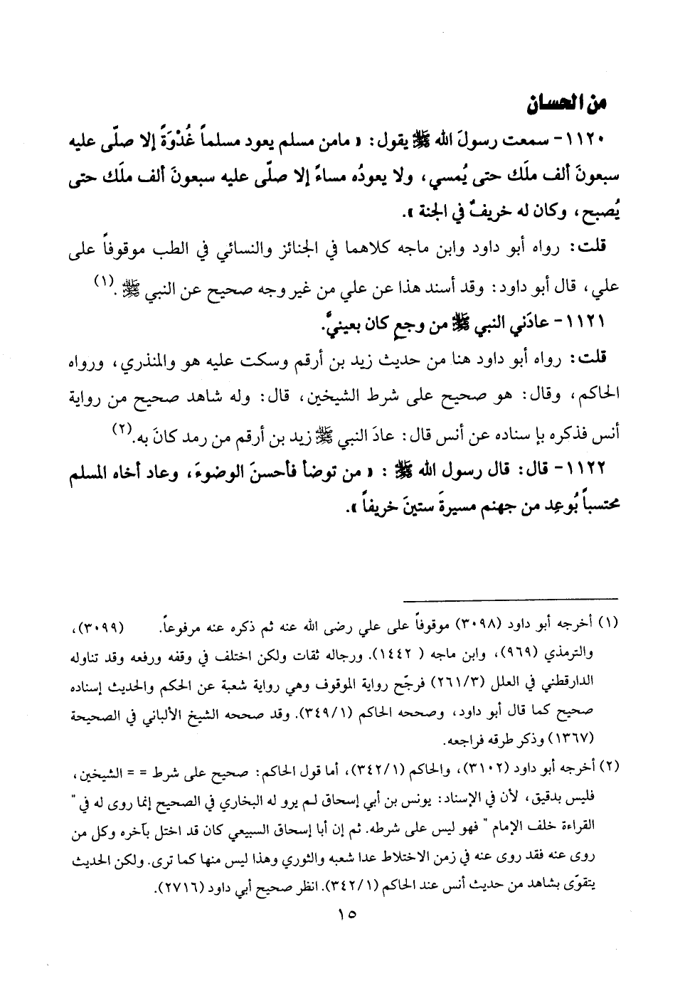 1120 - سمعت رسولَ الله - صلى الله عليه وسلم - يقول: "ما من مسلم يعود مسلمًا غُدْوَةً إلا صلّى عليه سبعونَ ألف ملَك حتى يُمسي، ولا يعودُه مساءً إلا صلّى عليه سبعونَ ألف ملَك حتى يُصبح، وكان له خريفٌ في الجنة".