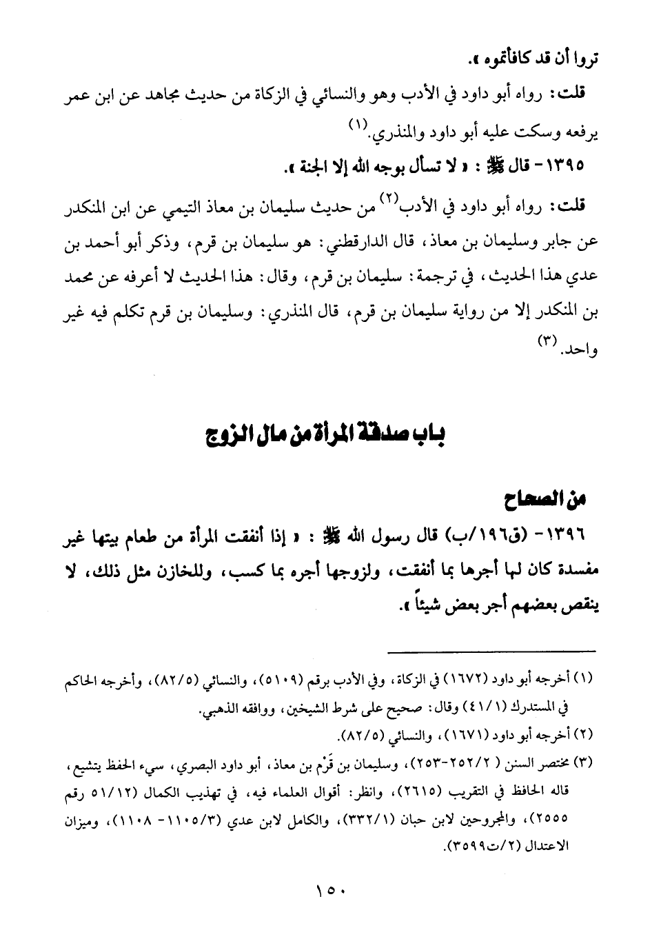 (¬3) مختصر السنن (2/ 252 - 253)، وسليمان بن قَرْم بن معاذ، أبو داود البصري، سيء الحفظ يتشيع، قاله الحافظ في التقريب (2615)، وانظر: أقوال العلماء فيه، في تهذيب الكمال (12/ 51 رقم 2555) والمجروحين لابن حبان (1/ 332)، والكامل لابن عدي (3/ 1105 - 1108)، وميزان الاعتدال (2/ ت 3599).