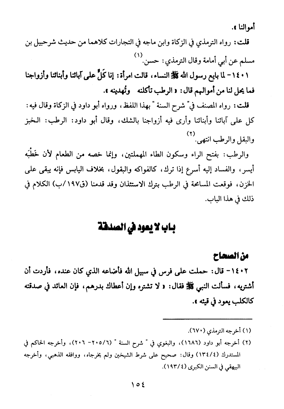 1402 - قال: حملت على فرس في سبيل الله فأضاعه الذي كان عنده، فأردت أن أشتريه، فسألت النبي -صلى الله عليه وسلم- فقال: "لا تشتره وإن أعطاك بدرهم، فإن العائد في صدقته كالكلب يعود في قيئه".