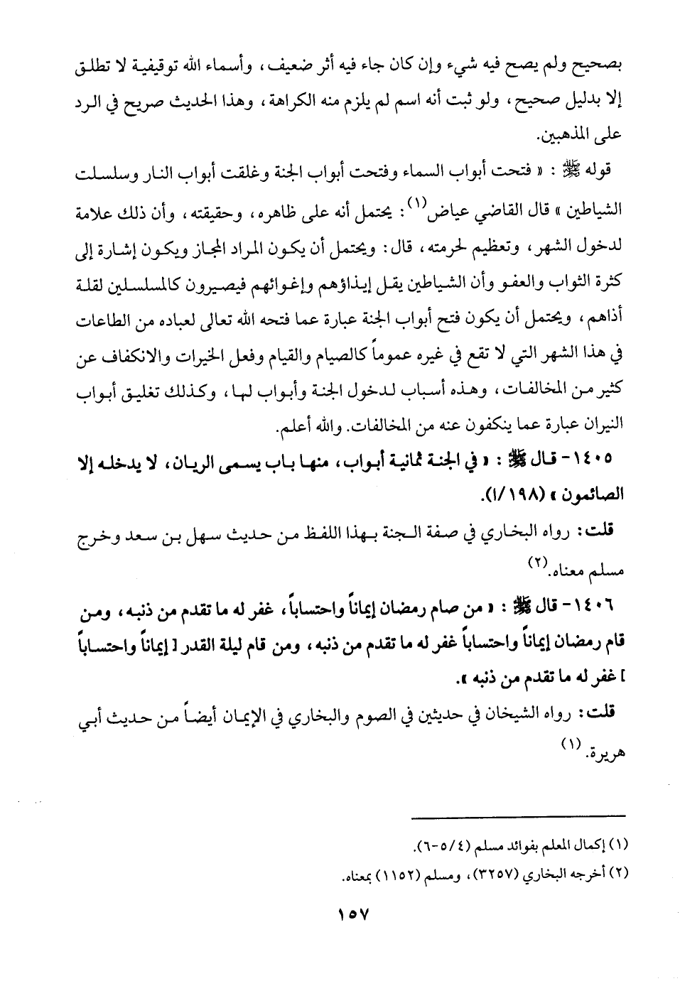 قوله - صلى الله عليه وسلم -: "فتحت أبواب السماء وفتحت أبواب الجنة وغلقت أبواب النار وسلسلت الشياطين" قال القاضي عياض (¬1): يحتمل أنه على ظاهره, وحقيقته, وأن ذلك علامة لدخول الشهر، وتعظيم لحرمته، قال: ويحتمل أن يكون المراد المجاز ويكون إشارة إلى كثرة الثواب والعفو وأن الشياطين يقل إيذاؤهم وإغوائهم فيصيرون كالمسلسلين لقلة أذاهم، ويحتمل أن يكون فتح أبواب الجنة عبارة عما فتحه الله تعالى لعباده من الطاعات في هذا الشهر التي لا تقع في غيره عمومًا كالصيام والقيام وفعل الخيرات والانكفاف عن كثير من المخالفات، وهذه أسباب لدخول الجنة وأبواب لها, كذلك تغليق أبواب النيران عبارة عما ينكفون عنه من المخالفات. والله أعلم.