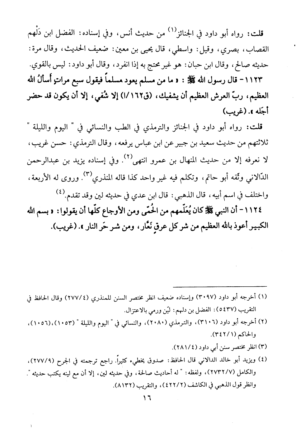 1123 - قال رسول الله - صلى الله عليه وسلم -: "ما من مسلم يعود مسلمًا فيقول سبع مراتٍ أسالُ الله العظيم، ربّ العرش العظيم أن يشفيك، إلا شُفي، إلا أن يكون قد حضر أجَله". (غريب)