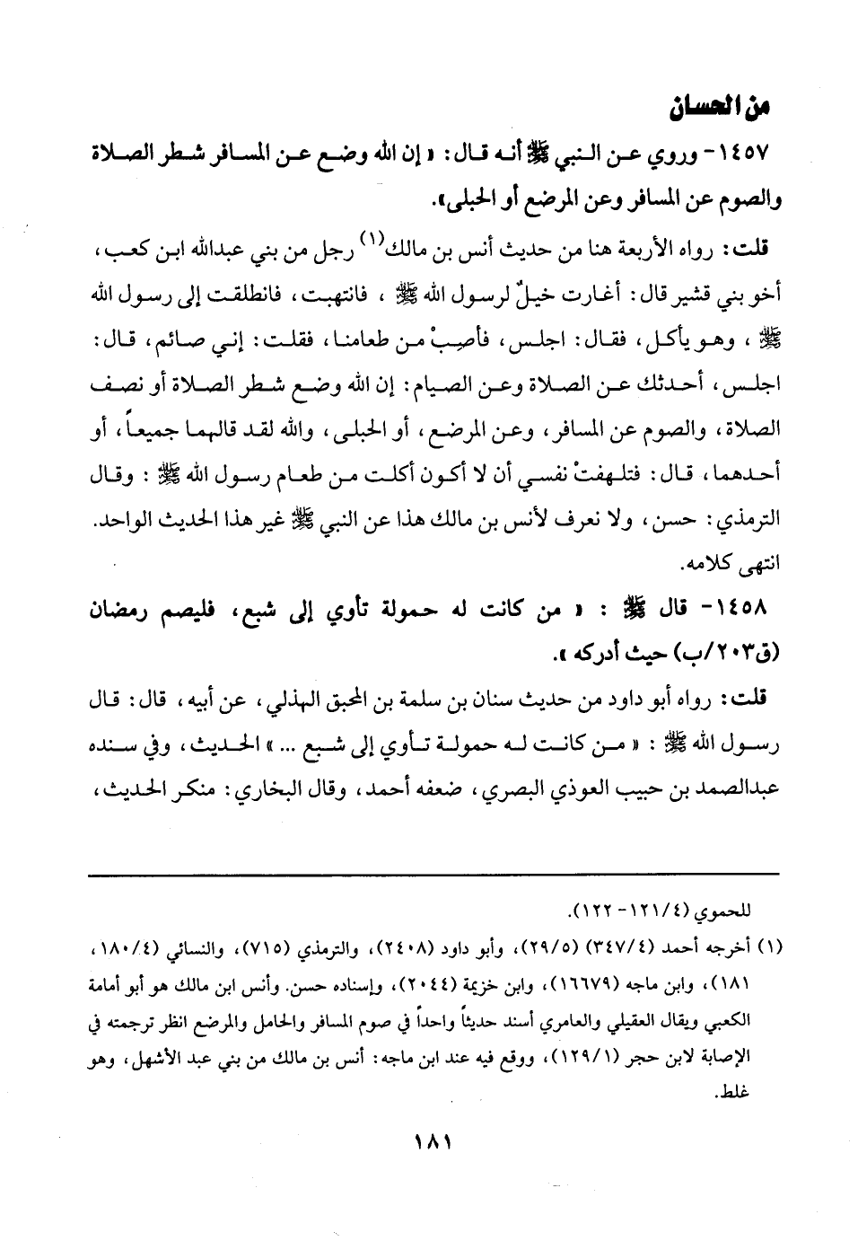 قلت: رواه الأربعة هنا من حديث أنس بن مالك (¬1) رجل من بني عبد الله ابن كعب، أخو بني قشير قال: أغارت خيلٌ لرسول الله -صلى الله عليه وسلم-، فانتهبت، فانطلقت إلى رسول الله - صلى الله عليه وسلم -، وهو يأكل، فقال: اجلس، فأصِبْ من طعامنا، فقلت: إني صائم، قال: اجلس، أحدثك عن الصلاة وعن الصيام: إن الله وضع شطر الصلاة أو نصف الصلاة، والصوم عن السافر، وعن المرضع، أو الحبلى، والله لقد قالهما جميعًا، أو أحدهما، قال: فتلهفتْ نفسي أن لا أكون أكلت من طعام رسول الله -صلى الله عليه وسلم-: وقال الترمذي: حسن، ولا نعرف لأنس بن مالك هذا عن النبي -صلى الله عليه وسلم- غير هذا الحديث الواحد.