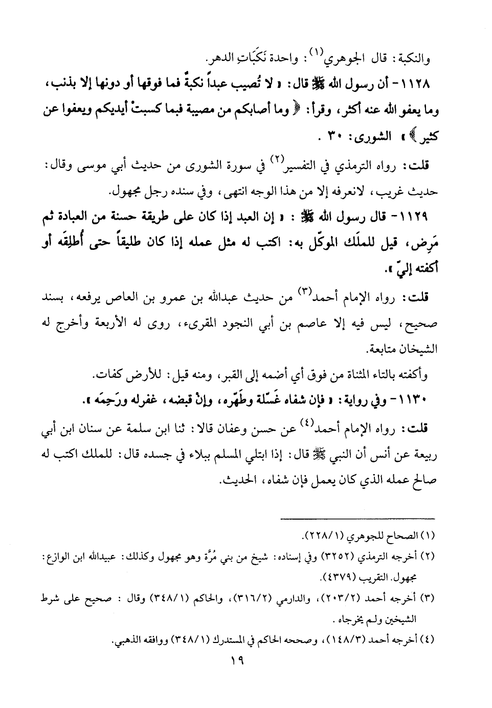 1128 - أن رسول الله - صلى الله عليه وسلم - قال: "لا تُصيب عبدًا نكبةٌ فما فوقها أو دونها إلا بذنب، وما يعفو الله عنه أكثر، وقرأ: {وما أصابكم من مصيبة فبما كسبتْ أيديكم ويعفوا عن كثير} " الشورى: 30.