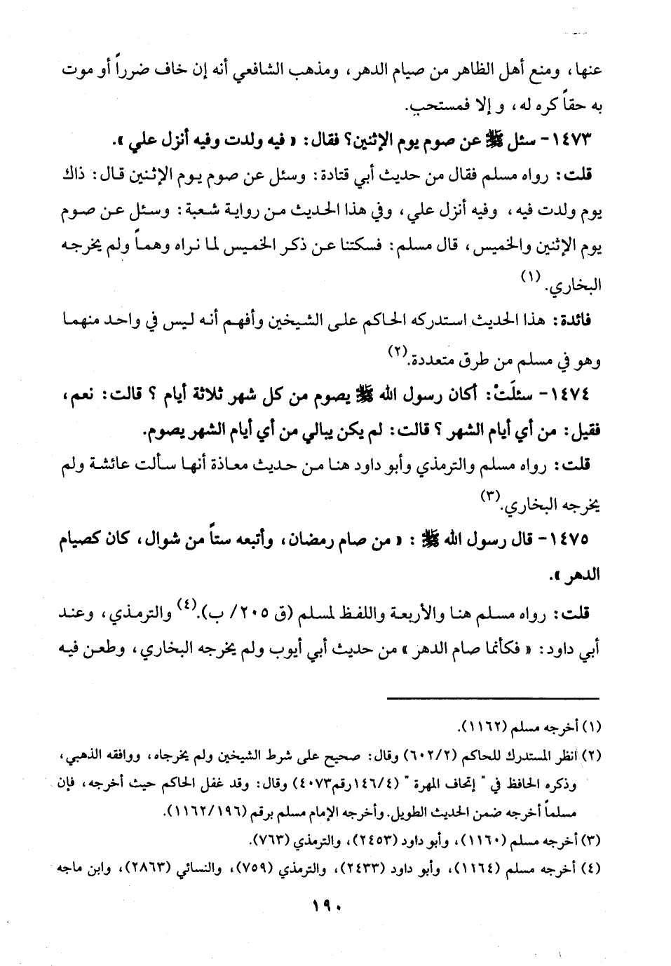 1473 - سئل - صلى الله عليه وسلم - عن صوم يوم الاثنين؟ فقال: "فيه ولدت وفيه أنزل علي".