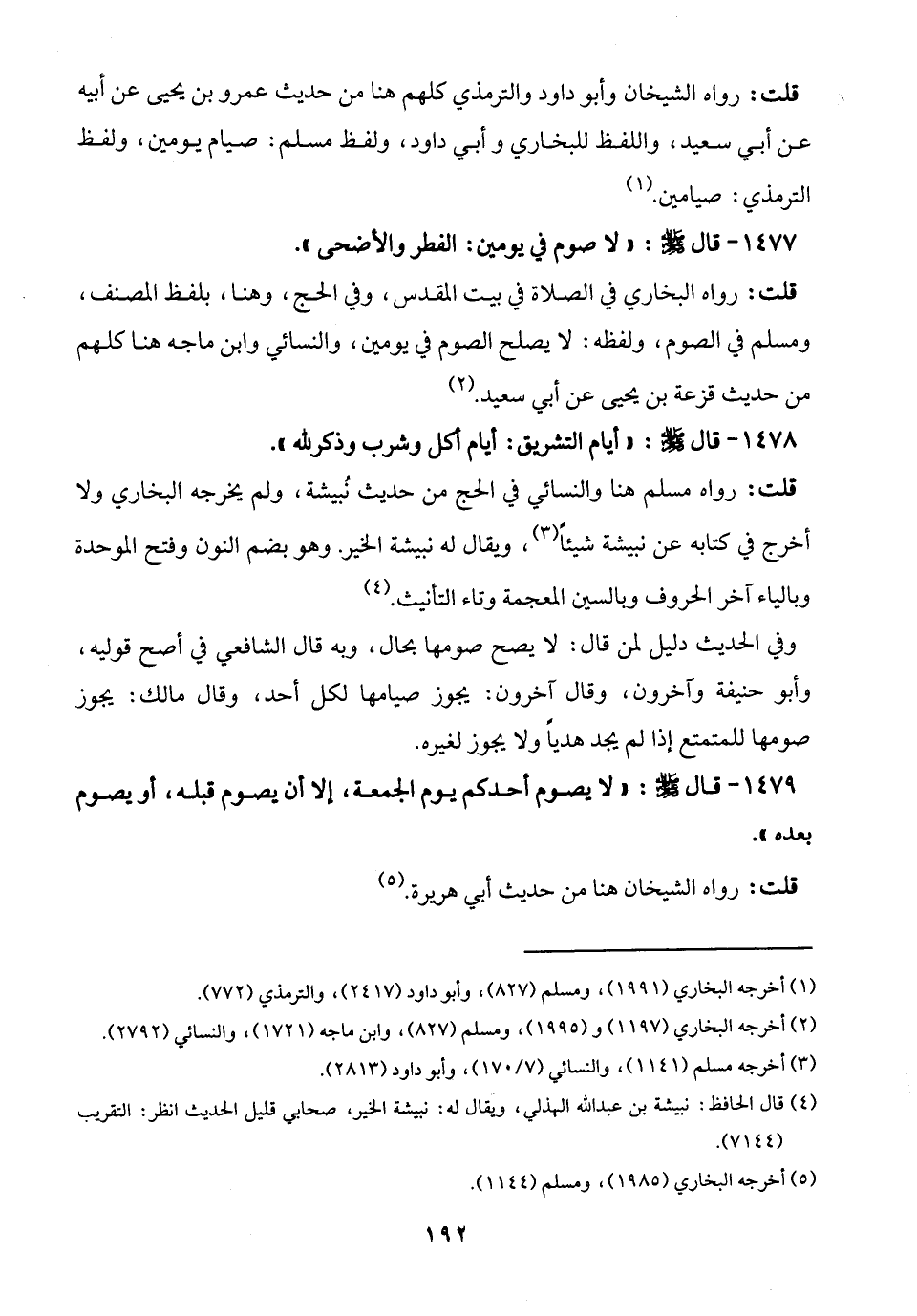 1477 - قال - صلى الله عليه وسلم -: "لا صوم في يومين: الفطر والأضحى".