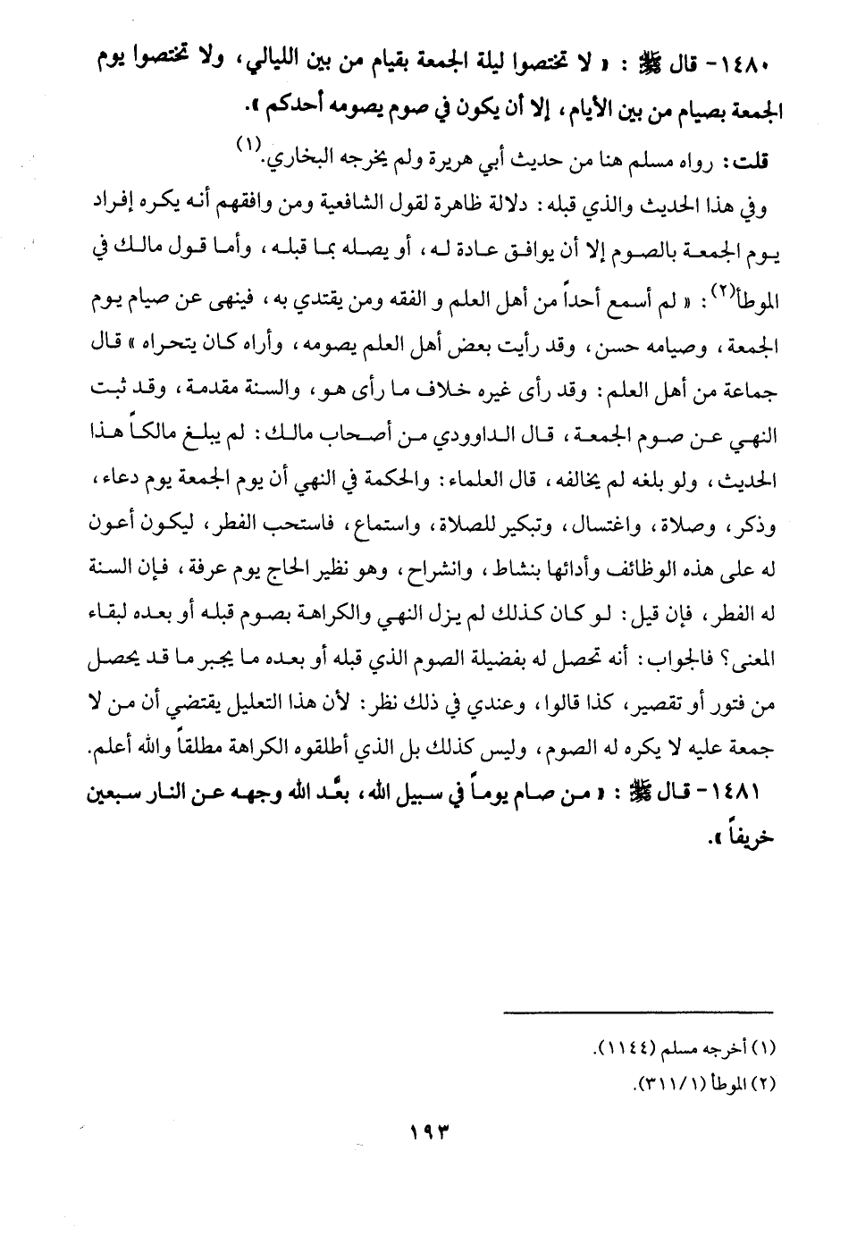 1480 - قال - صلى الله عليه وسلم -: "لا تختصوا ليلة الجمعة بقيام من بين الليالي، ولا تختصوا يوم الجمعة بصيام من بين الأيام، إلا أن يكون في صوم يصومه أحدكم".