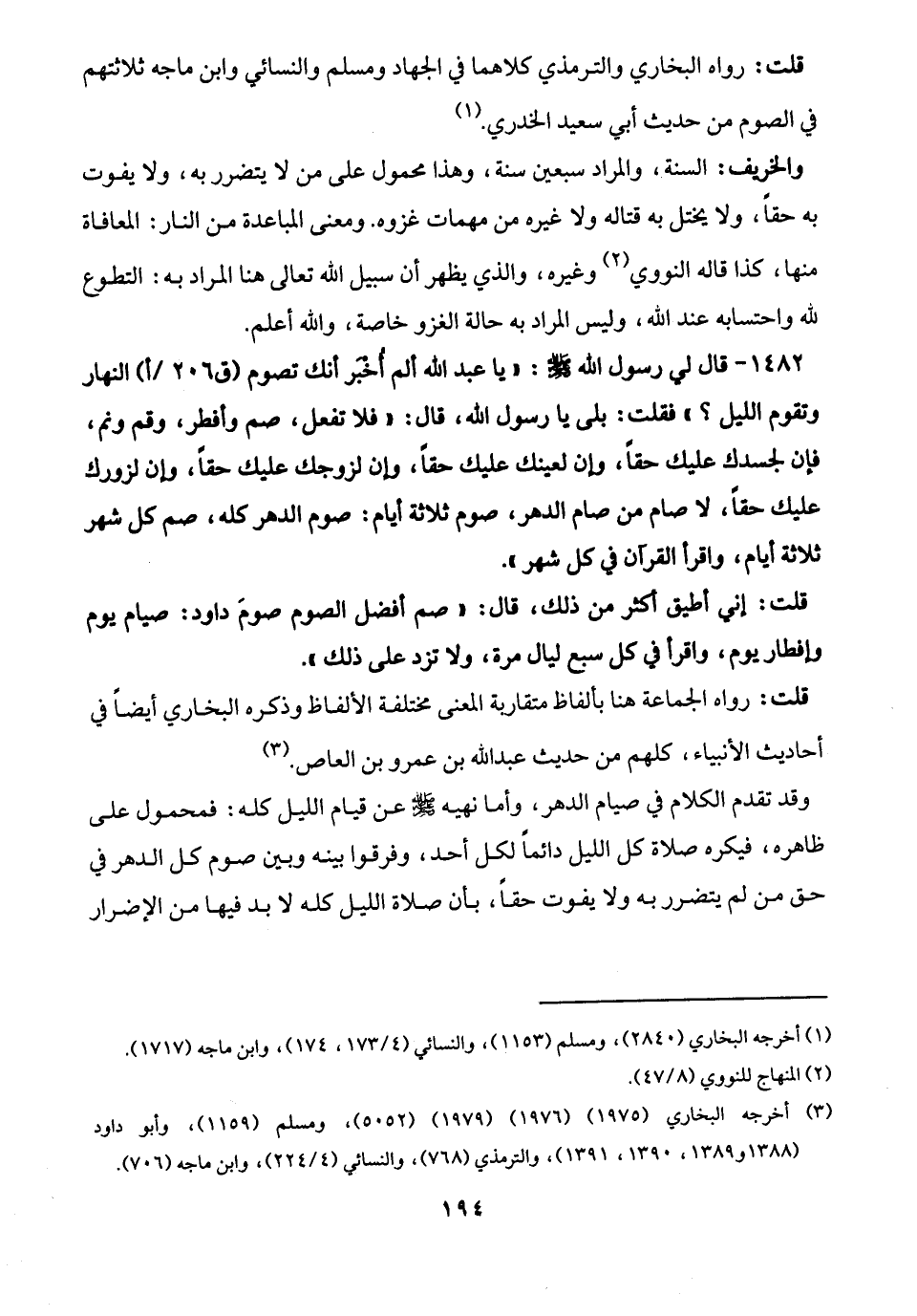 1482 - قال لي رسول الله -صلى الله عليه وسلم-: "يا عبد الله ألم أُخْبَر أنك تصوم النهار وتقوم الليل؟ " فقلت: بلى يا رسول الله، قال: "فلا تفعل، صم وأفطر، وقم ونم، فإن لجسدك عليك حقًّا، وإن لعينك عليك حقًّا، وإن لزوجك عليك حقًّا، وإن لزورك عليك حقًّا، لا صام من صام الدهر، صوم ثلاثة أيام: صوم الدهر كله، صم كل شهر ثلاثة أيام، واقرأ القرآن في كل شهر".