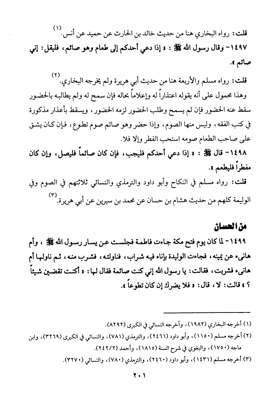 1497 - وقال رسول الله -صلى الله عليه وسلم-: "إذا دعي أحدكم إلى طعام وهو صائم، فليقل: إني صائم".