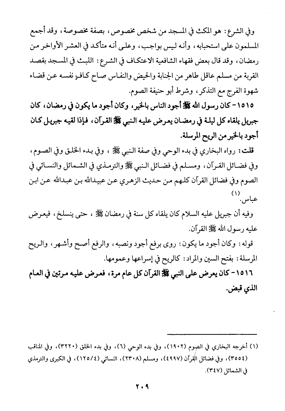 1515 - كان رسول الله -صلى الله عليه وسلم- أجود الناس بالخير، وكان أجود ما يكون في رمضان، كان جبريل يلقاه كل ليلة في رمضان يعرض عليه النبي -صلى الله عليه وسلم- القرآن، فإذا لقيه جبريل كان أجود بالخير من الريح المرسلة.