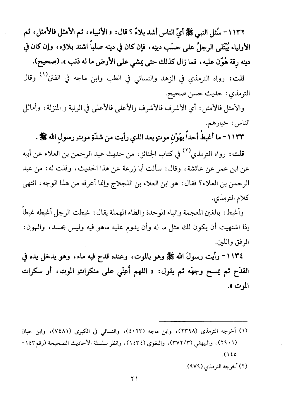 1132 - سُئل النبي - صلى الله عليه وسلم - أيّ الناس أشد بلاءً؟ قال: "الأنبياء، ثم الأمثل فالأمثل، ثم الأولياء يُبتلى الرجلُ على حسَب دينه، فإن كان في دينه صلبًا اشتد بلاؤه، وإن كان في دينه رِقة هُوّن عليه، فما زال كذلك حتى يمشي على الأرض ما له ذنب". (صحيح).
