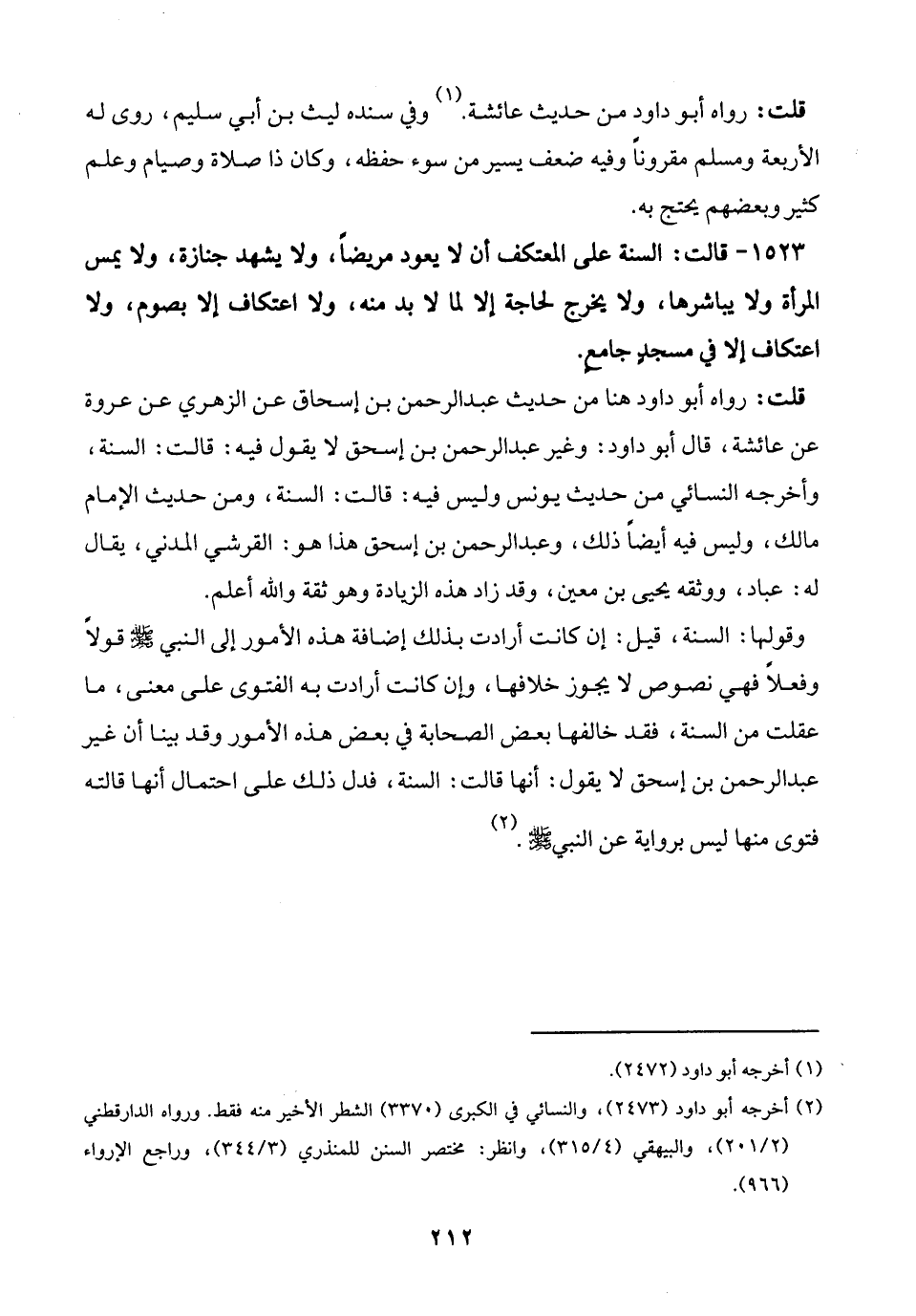 قلت: رواه أبو داود هنا من حديث عبد الرحمن بن إسحاق عن الزهري عن عروة عن عائشة، قال أبو داود: وغير عبد الرحمن بن إسحاق لا يقول فيه: قالت: السنة، وأخرجه النسائيُّ من حديث يونس وليس فيه: قالت: السنة، ومن حديث الإمام مالك، وليس فيه أيضًا ذلك، وعبد الرحمن بن إسحاق هذا هو: القرشي المدني، يقال له: عباد، ووثقه يحيى بن معين، وقد زاد هذه الزيادة وهو ثقة والله أعلم.