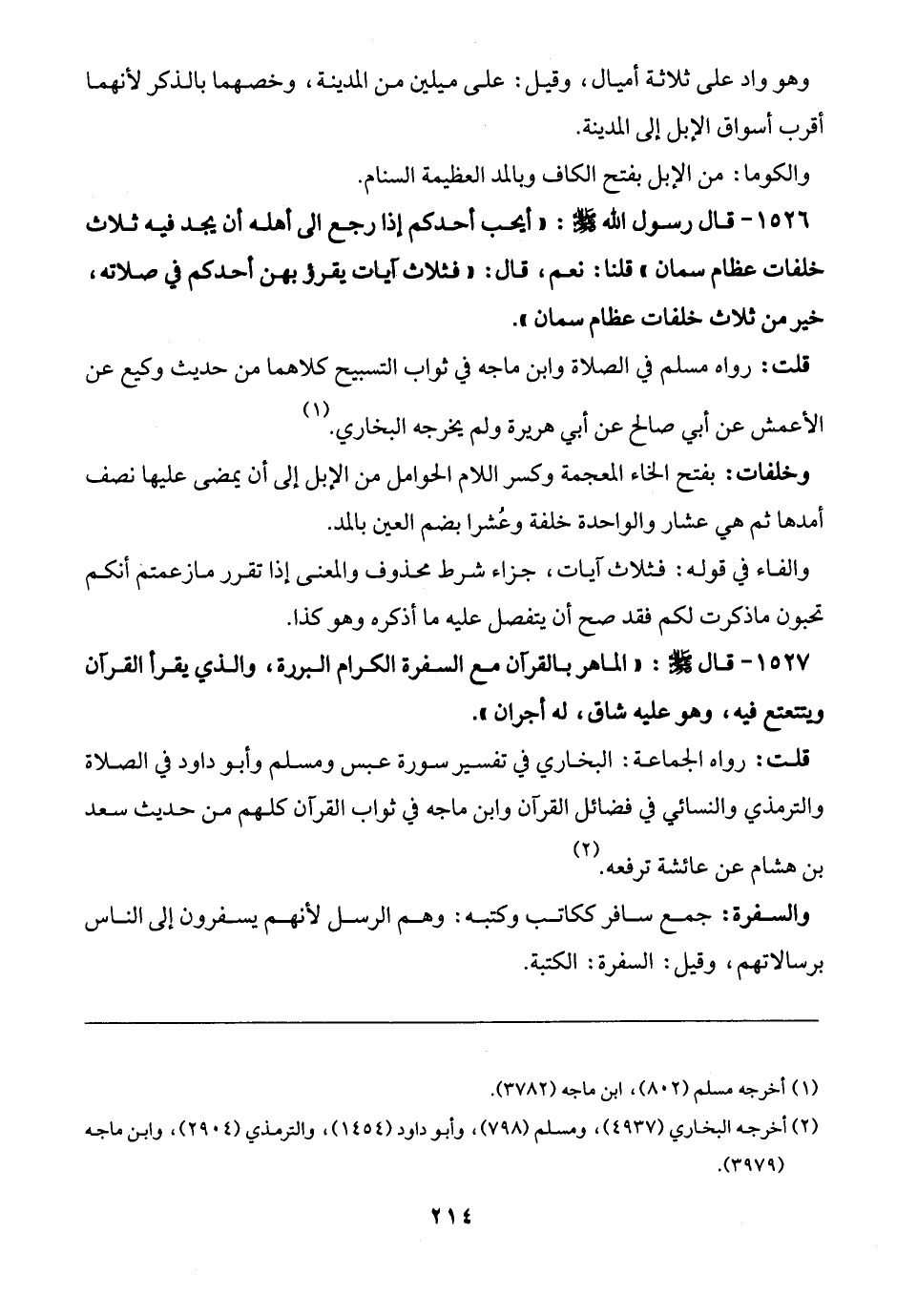 1526 - قال رسول الله -صلى الله عليه وسلم-: "أيحب أحدكم إذا رجع إلى أهله أن يجد فيه ثلاث خلفات عظام سمان" قلنا: نعم، قال: "فثلاث آيات يقرؤ بهن أحدكم في صلاته، خير من ثلاث خلفات عظام سمان".