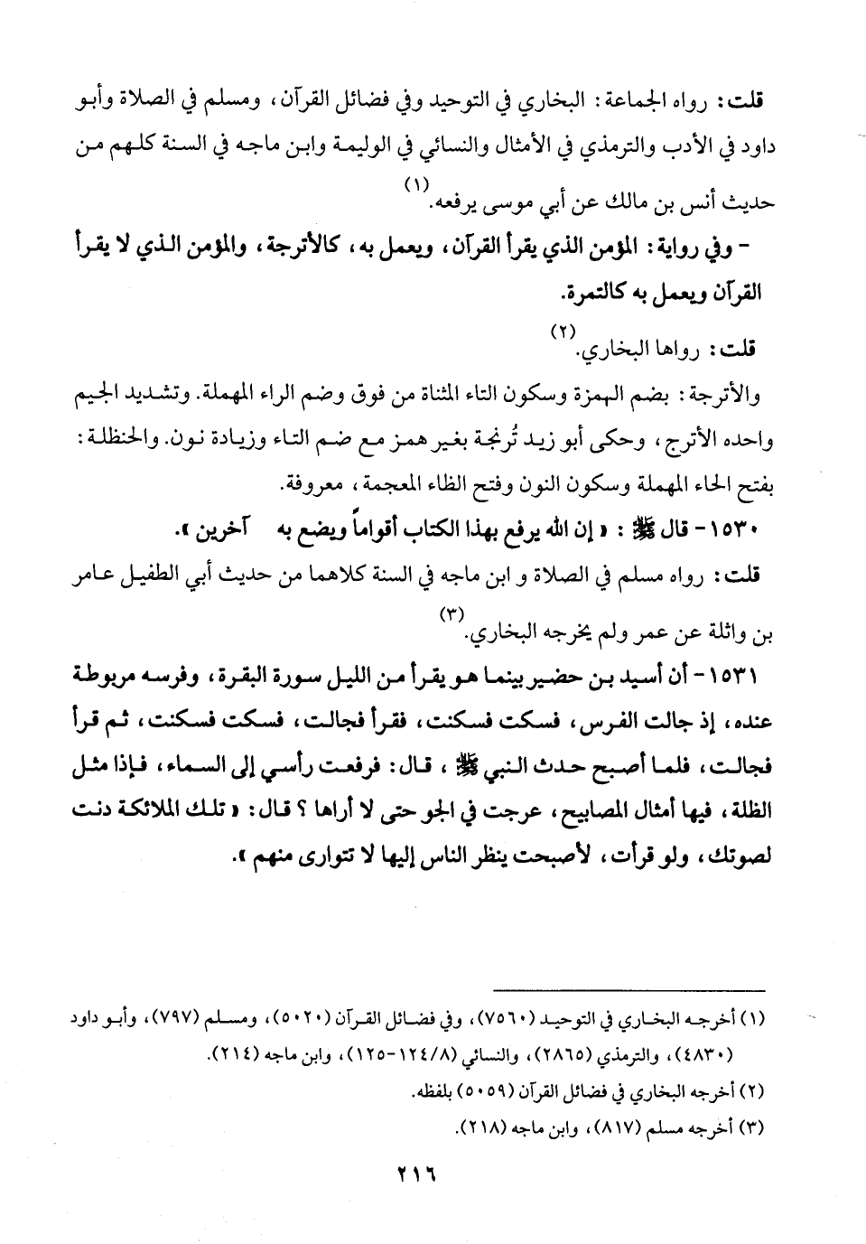1531 - أن أسيد بن حضير بينما هو يقرأ من الليل سورة البقرة، وفرسه مربوطة عنده، إذ جالت الفرس، فسكت فسكنت، فقرأ فجالت، فسكت فسكنت، ثمَّ قرأ فجالت، فلما أصبح حدث النبي -صلى الله عليه وسلم-، قال: فرفعت رأسي إلى السماء، فإذا مثل الظلة، فيها أمثال المصابيح، عرجت في الجو حتى لا أراها؟ قال: "تلك الملائكة دنت لصوتك، ولو قرأت، لأصبحت ينظر الناس إليها لا تتوارى منهم".