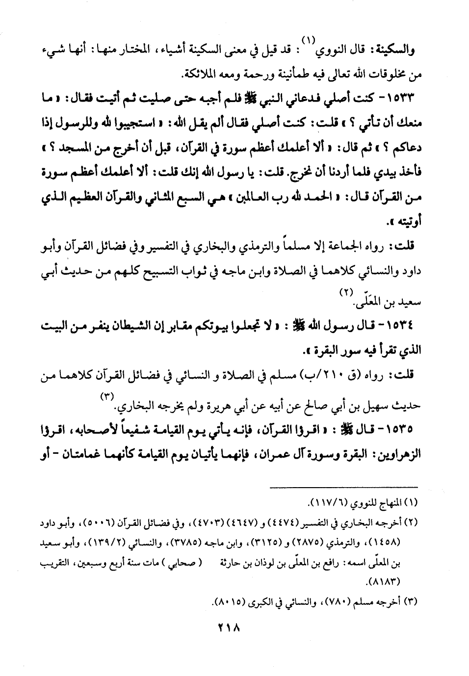 (¬2) أخرجه البخاري في التفسير (4474) و (4647) (4703)، وفي فضائل القرآن (5006)، وأبو داود (1458)، والترمذي (2875) و (3125)، وابن ماجه (3785)، والنسائيُّ (2/ 139)، وأبو سعيد بن المعلّى اسمه: رافع بن المعلّى بن لوذان بن حارثة (صحابي) مات سنة أربع وسبعين، التقريب (8183).