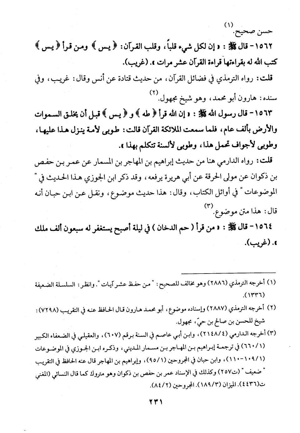 1563 - قال رسول الله -صلى الله عليه وسلم-: "إن الله قرأ {طه} و {يس} قبل أن يخلق السموات والأرض بألف عام، فلما سمعت الملائكة القرآن قالت: طوبى لأمة ينزل هذا عليها، وطوبى لأجواف تحمل هذا، وطوبى لألسنة تتكلم بهذا".