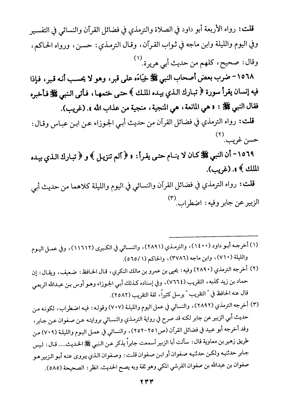 (¬3) أخرجه الترمذي (2892)، والنسائيُّ في عمل اليوم والليلة (707) وقوله: فيه اضطراب، لكونه من حديث أبي الزبير عن جابر لكنه قد صرح في رواية الترمذي والنسائيُّ بروايته عن صفوان عن جابر، وقد أخرجه أبو عبيد في فضائل القرآن (ص 251 - 252)، والنسائيُّ في عمل اليوم والليلة (709) من طريق زهير بن معاوية قال: سألت أبا الزبير أسمعت جابرًا يذكر عن النبي -صلى الله عليه وسلم- الحديث ..... قال: ليس جابر حدثنيه ولكن حدثنيه صفوان أو ابن صفوان قلت: وصفوان الذي يروى عنه أبو الزبير هو صفوان بن عبد الله بن صفوان القرشي المكي وهو ثقة وبه يصح الحديث. انظر: الصحيحة (585).