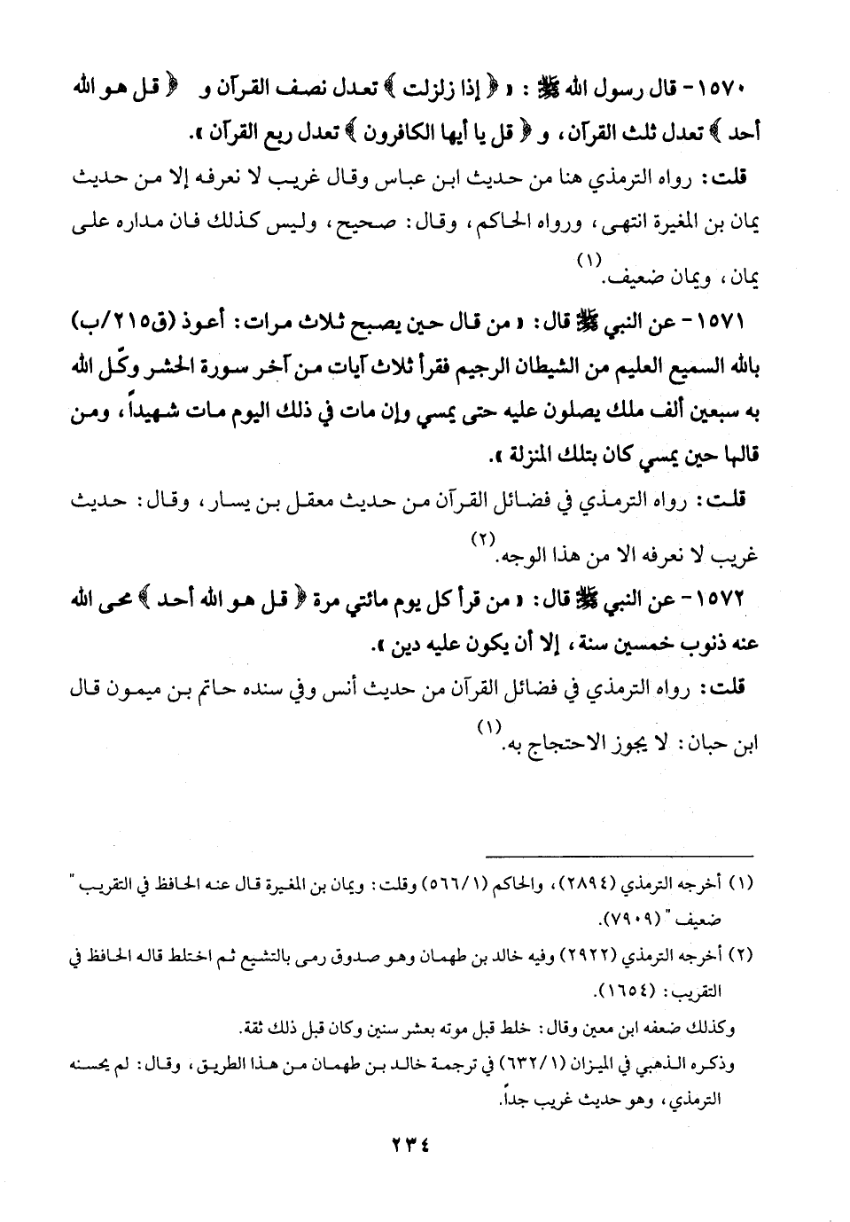1570 - قال رسول الله -صلى الله عليه وسلم-: {إِذَا زُلْزِلَتِ} تعدل نصف القرآن و {قُلْ هُوَ اللَّهُ أَحَدٌ} تعدل ثلث القرآن، و {قُلْ يَاأَيُّهَا الْكَافِرُونَ} تعدل ربع القرآن".