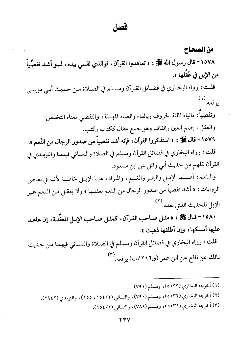1580 - قال - صلى الله عليه وسلم -: "مثل صاحب القرآن، كمثل صاحب الإبل المعقَّلة، إن عاهد عليها أمسكها، وإن أطلقها ذهبت".