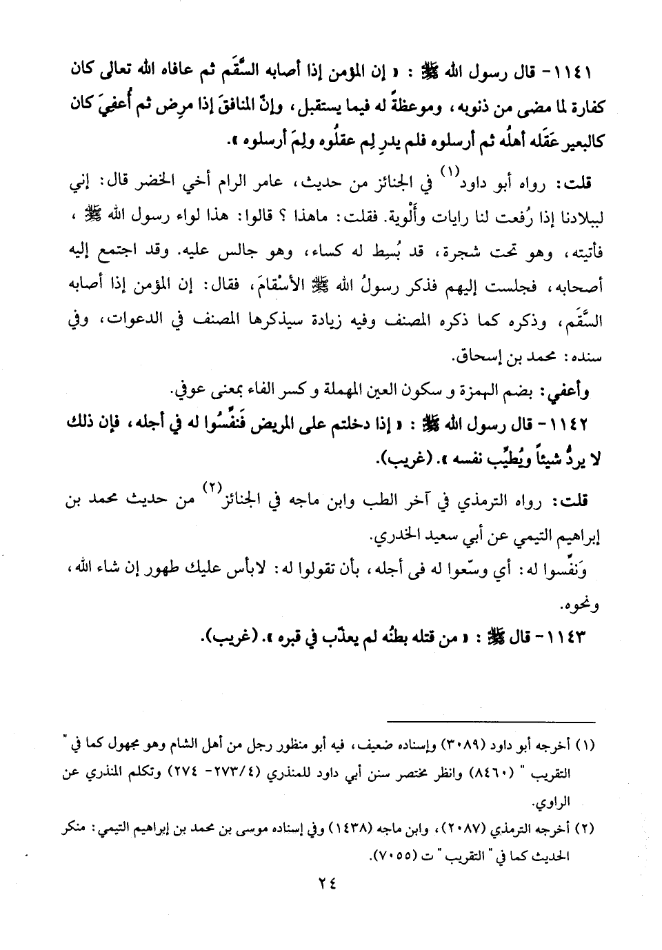 1142 - قال رسول الله - صلى الله عليه وسلم -: "إذا دخلتم على المريض فَنفِّسُوا له في أجله، فإن ذلك لا يردُّ شيئًا ويُطيِّب نفسه". (غريب).