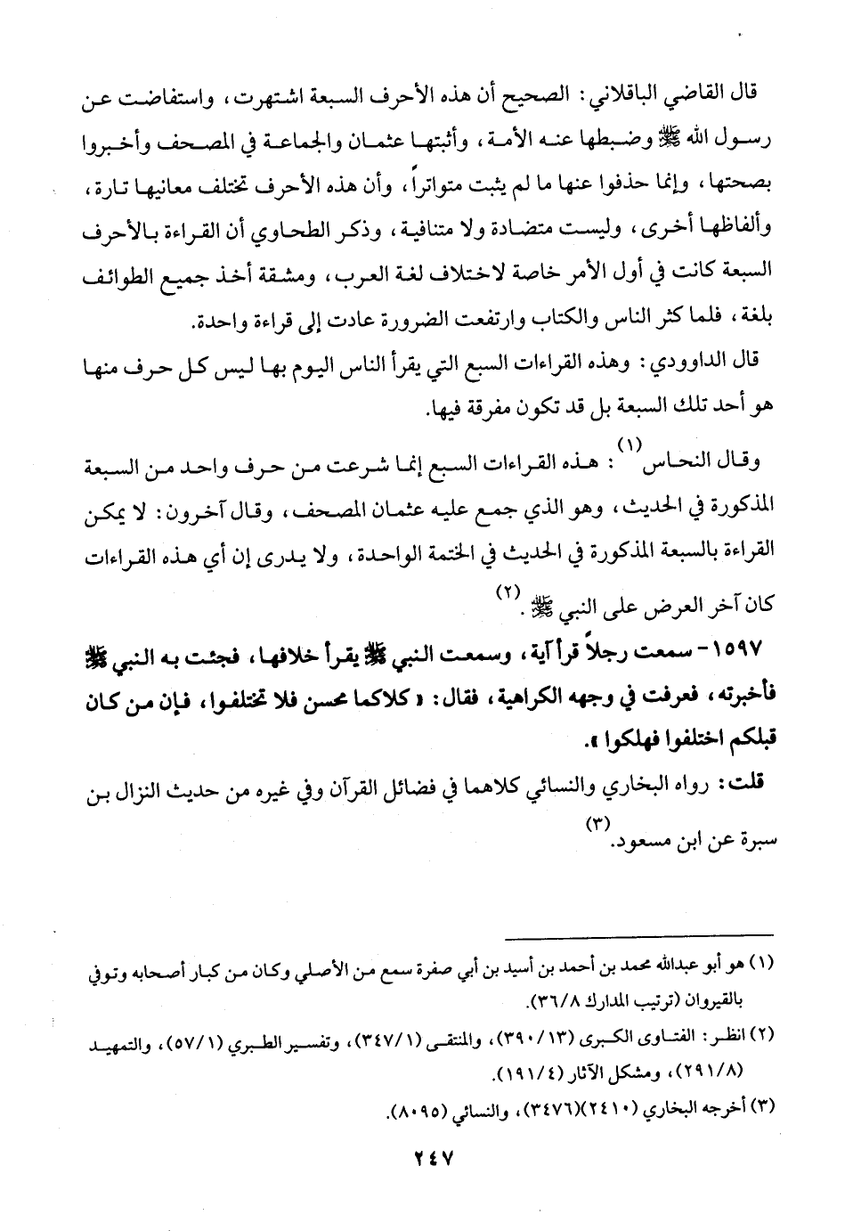 قال القاضي الباقلاني: الصحيح أن هذه الأحرف السبعة اشتهرت، واستفاضت عن رسول الله -صلى الله عليه وسلم- وضبطها عنه الأمة، وأثبتها عثمان والجماعة في المصحف وأخبروا بصحتها، وإنما حذفوا عنها ما لم يثبت متواترًا، وأن هذه الأحرف تختلف معانيها تارة، وألفاظها أخرى، وليست متضادة ولا متنافية، وذكر الطحاوي أن القراءة بالأحرف السبعة كانت في أول الأمر خاصة لاختلاف لغة العرب، ومشقة أخذ جميع الطوائف بلغة، فلما كثر الناس والكتاب وارتفعت الضرورة عادت إلى قراءة واحدة.