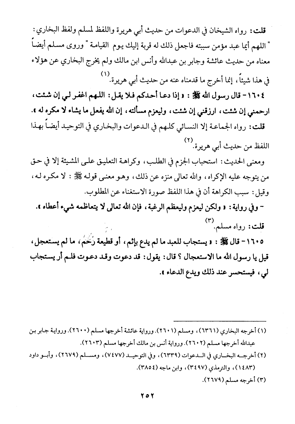 1604 - قال رسول الله -صلى الله عليه وسلم-: "إذا دعا أحدكم فلا يقل: اللهم اغفر لي إن شئت، ارحمني إن شئت، ارزقني إن شئت، وليعزم مسألته، إن الله يفعل ما يشاه لا مكره له".