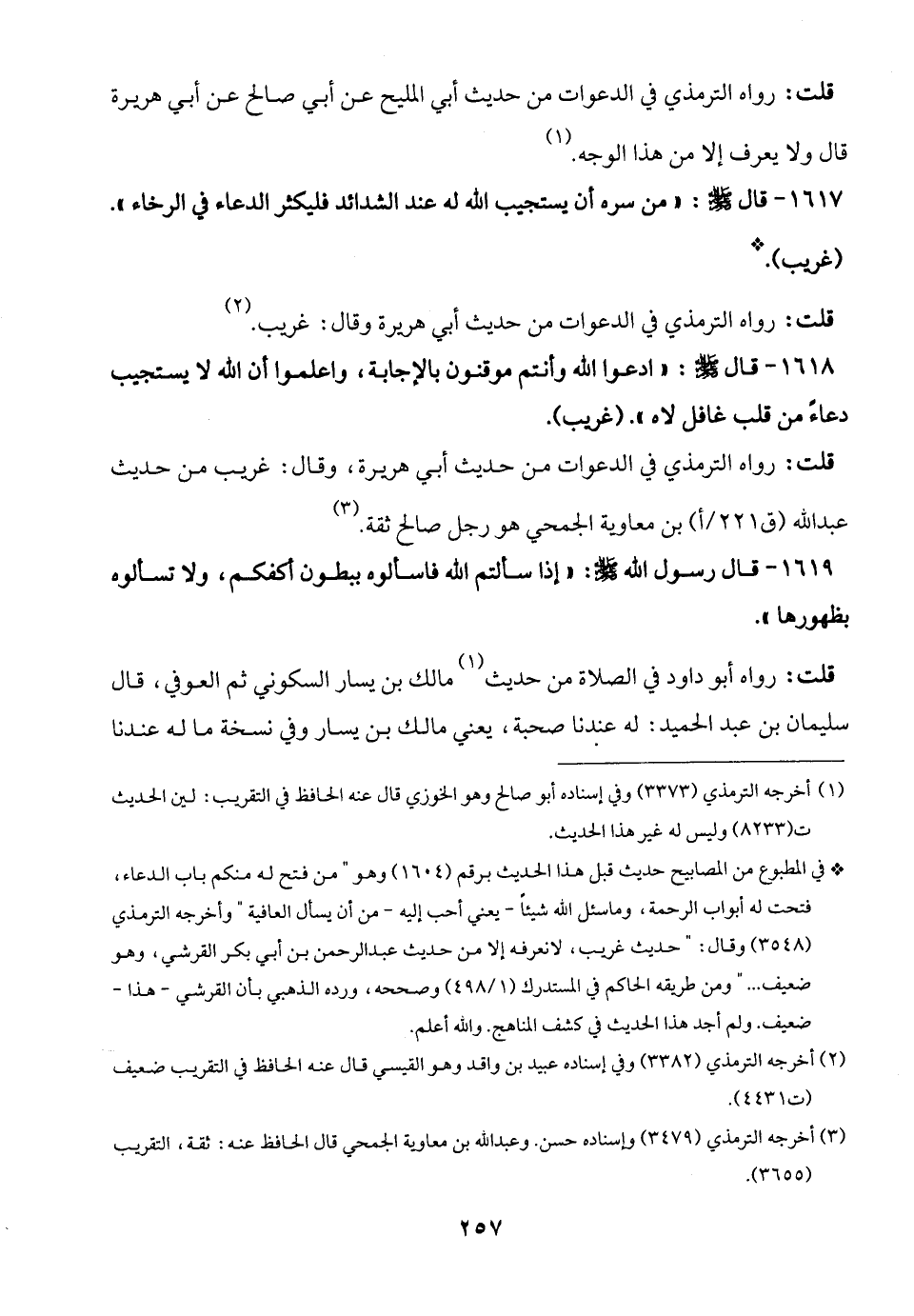 1618 - قال - صلى الله عليه وسلم -: "ادعوا الله وأنتم موقنون بالإجابة، واعلموا أن الله لا يستجيب دعاءً من قلب غافل لاه". (غريب).