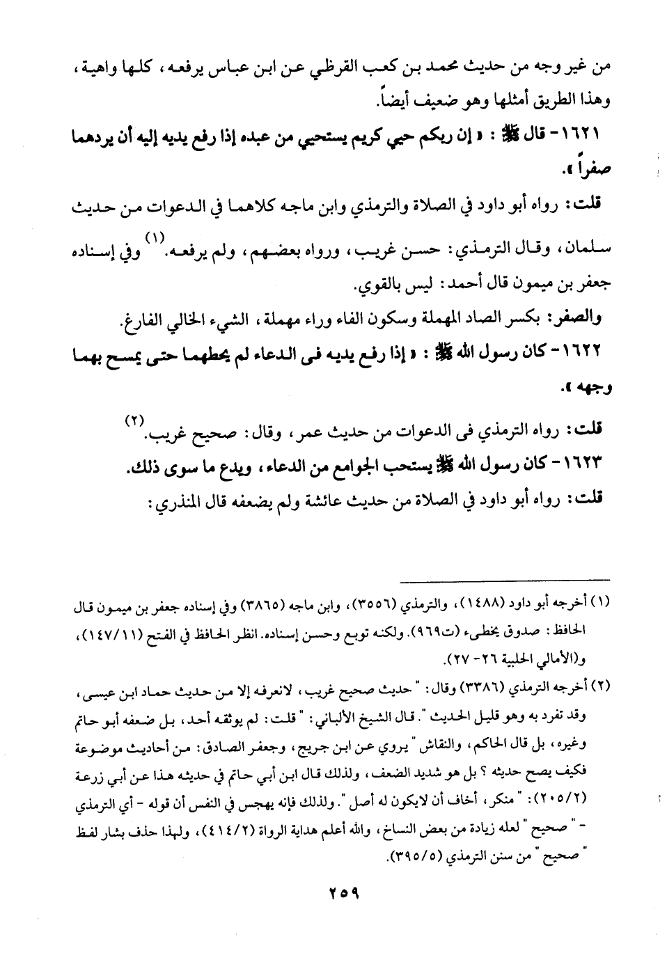 1622 - كان رسول الله -صلى الله عليه وسلم-: "إذا رفع يديه في الدعاء لم يحطهما حتى يمسح بهما وجهه".