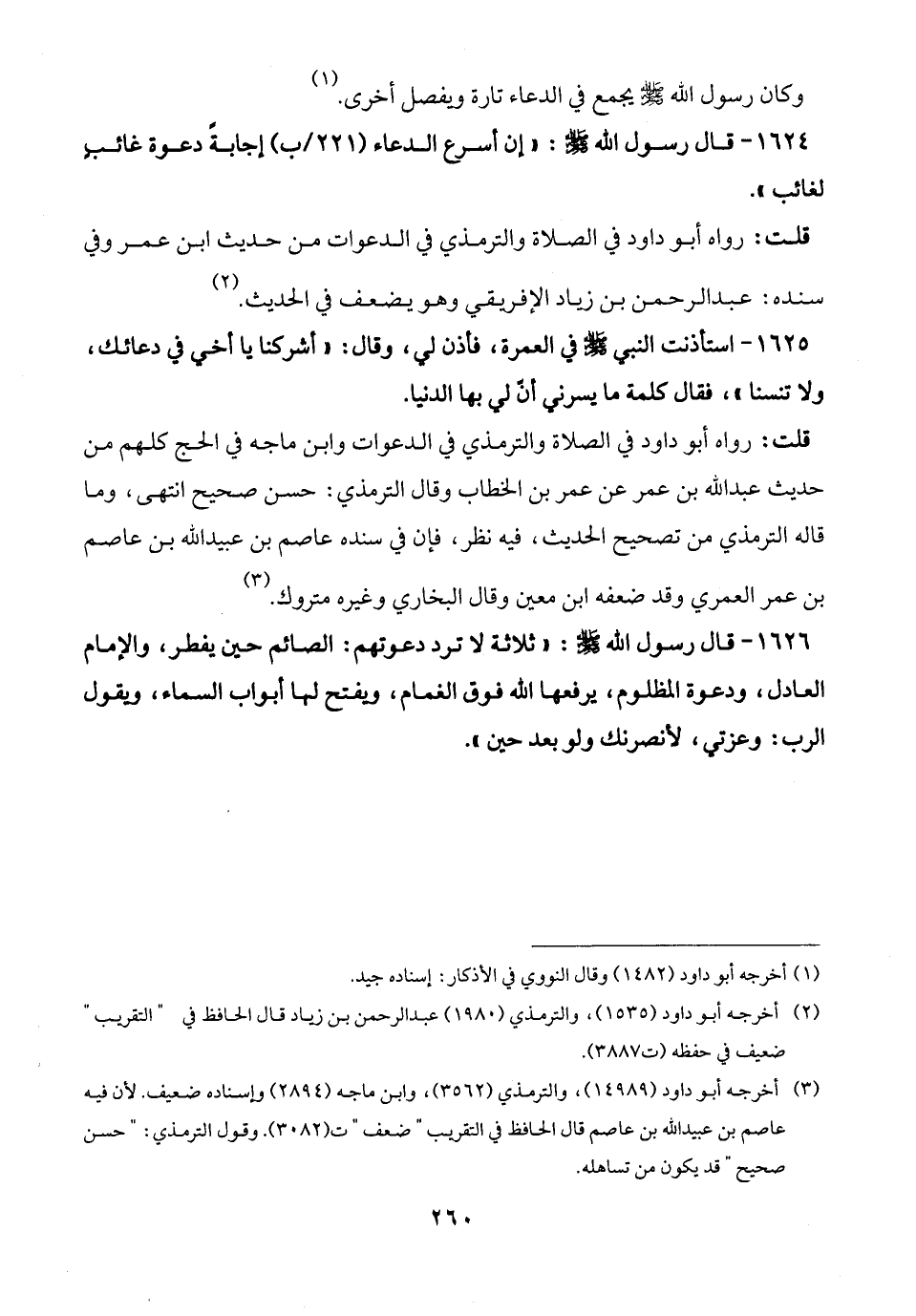 قلت: رواه أبو داود في الصلاة والترمذي في الدعوات وابن ماجه في الحج كلهم من حديث عبد الله بن عمر عن عمر بن الخطّاب وقال الترمذي: حسن صحيح انتهى، وما قاله الترمذي من تصحيح الحديث، فيه نظر، فإن في سنده عاصم بن عبيد الله بن عاصم بن عمر العمري وقد ضعفه ابن معين وقال البخاري وغيره متروك. (¬3)