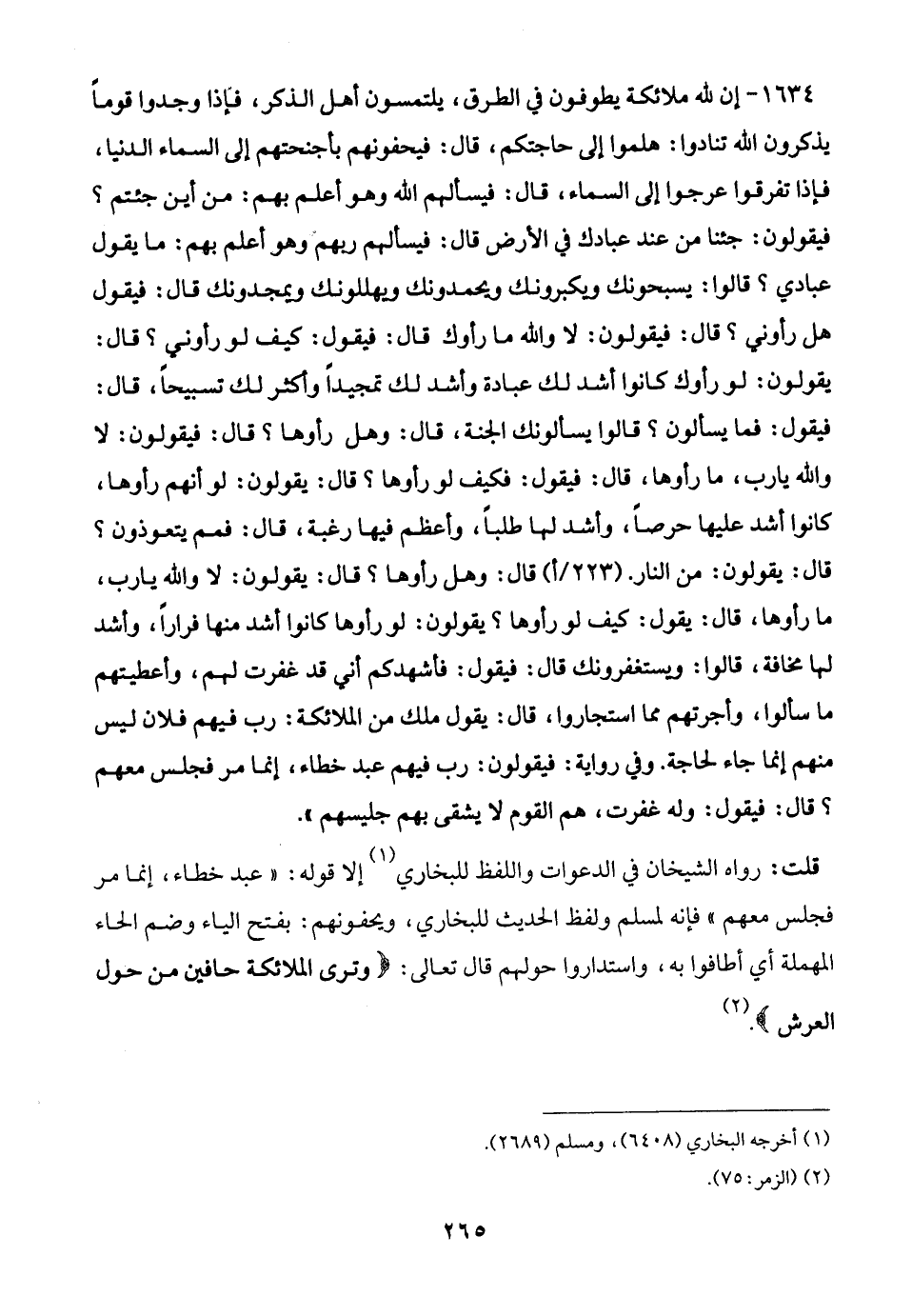 1634 - إن لله ملائكة يطوفون في الطرق، يلتمسون أهل الذكر، فإذا وجدوا قومًا يذكرون الله تنادوا: هلموا إلى حاجتكم، قال: فيحفونهم بأجنحتهم إلى السماء الدنيا، فإذا تفرقوا عرجوا إلى السماء، قال: فيسألهم الله وهو أعلم بهم: من أين جئتم؟ فيقولون: جئنا من عند عبادك في الأرض قال: فيسألهم ربهم وهو أعلم بهم: ما يقول عبادي؟ قالوا: يسبحونك ويكبرونك ويحمدونك ويهللونك ويمجدونك قال: فيقول هل رأوني؟ قال: فيقولون: لا والله ما رأوك قال: فيقول: كيف لو رأوني؟ قال: يقولون: لو رأوك كانوا أشد لك عبادة وأشد لك تمجيدًا وأكثر لك تسبيحًا، قال: فيقول: فما يسألون؟ قالوا يسألونك الجنة، قال: وهل رأوها؟ قال: فيقولون: لا والله يا رب، ما رأوها، قال: فيقول: فكيف لو رأوها؟ قال: يقولون: لو أنهم رأوها، كانوا أشد عليها حرصًا، وأشد لها طلبًا، وأعظم فيها رغبةً، قال: فمم يتعوذون؟ قال: يقولون: من النار. قال: وهل رأوها؟ قال: يقولون: لا والله يا رب، ما رأوها، قال: يقول: كيف لو رأوها؟ يقولون: لو رأوها كانوا أشد منها فرارًا، وأشد لها مخافة، قالوا: ويستغفرونك قال: فيقول: فأشهدكم أني قد غفرت لهم، وأعطيتهم ما سألوا، وأجرتهم مما استجاروا، قال: يقول ملك من الملائكة: رب فيهم فلان ليس منهم إنما جاء لحاجة. وفي رواية: فيقولون: رب فيهم عبد خطاء، إنما مر فجلس معهم؟ قال: فيقول: وله غفرت، هم القوم لا يشقى بهم جليسهم".