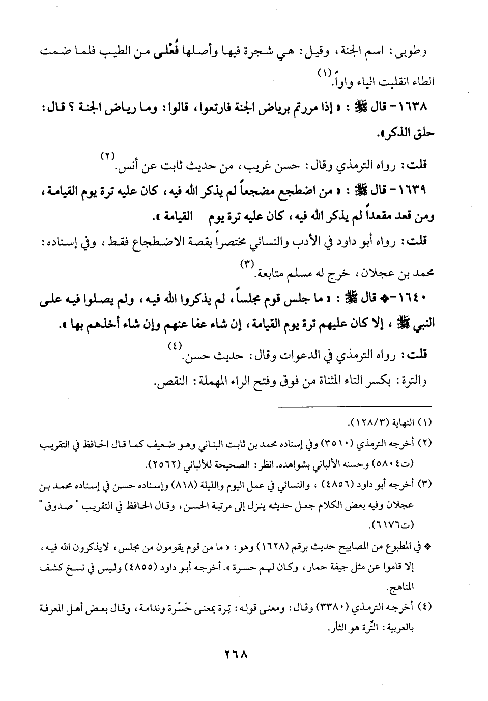 1640 - *قال - صلى الله عليه وسلم -: "ما جلس قوم مجلسًا، لم يذكروا الله فيه، ولم يصلوا فيه على النبي -صلى الله عليه وسلم-، إلا كان عليهم ترة يوم القيامة، إن شاء عفا عنهم وإن شاء أخذهم بها".