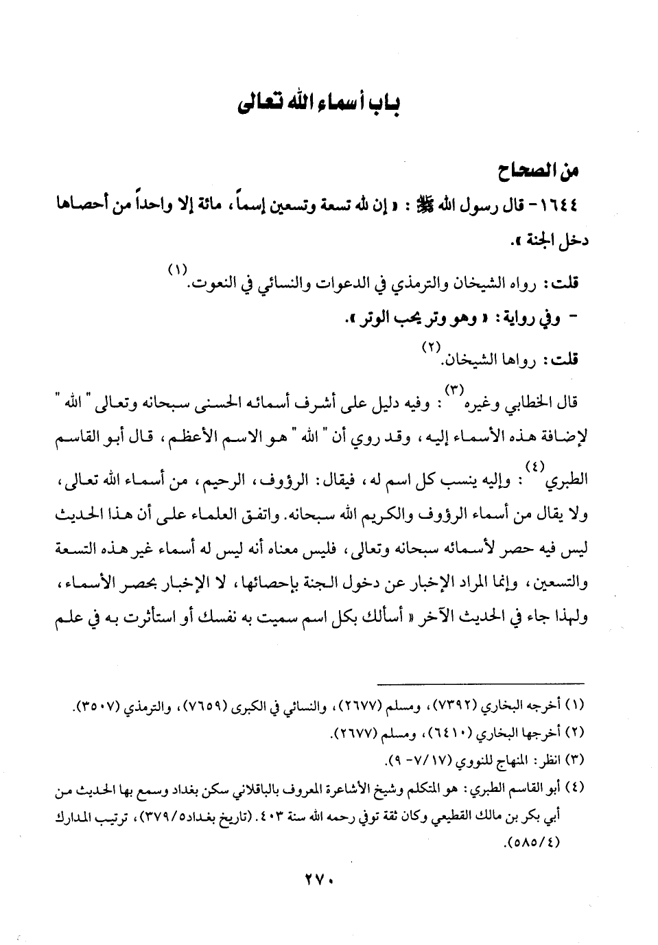 1644 - قال رسول الله -صلى الله عليه وسلم-: "إن لله تسعة وتسعين إسمًا، مائة إلا واحدًا من أحصاها دخل الجنة".