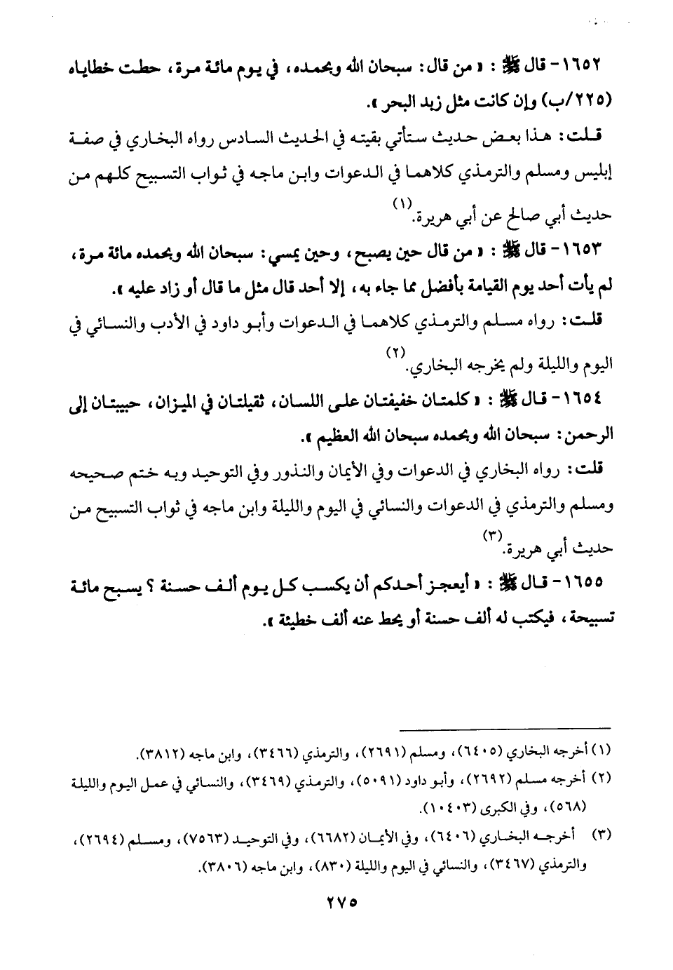1653 - قال - صلى الله عليه وسلم -: "من قال حين يصبح، وحين يمسي: سبحان الله وبحمده مائة مرة، لم يأت أحد يوم القيامة بأفضل مما جاء به، إلا أحد قال مثل ما قال أو زاد عليه".