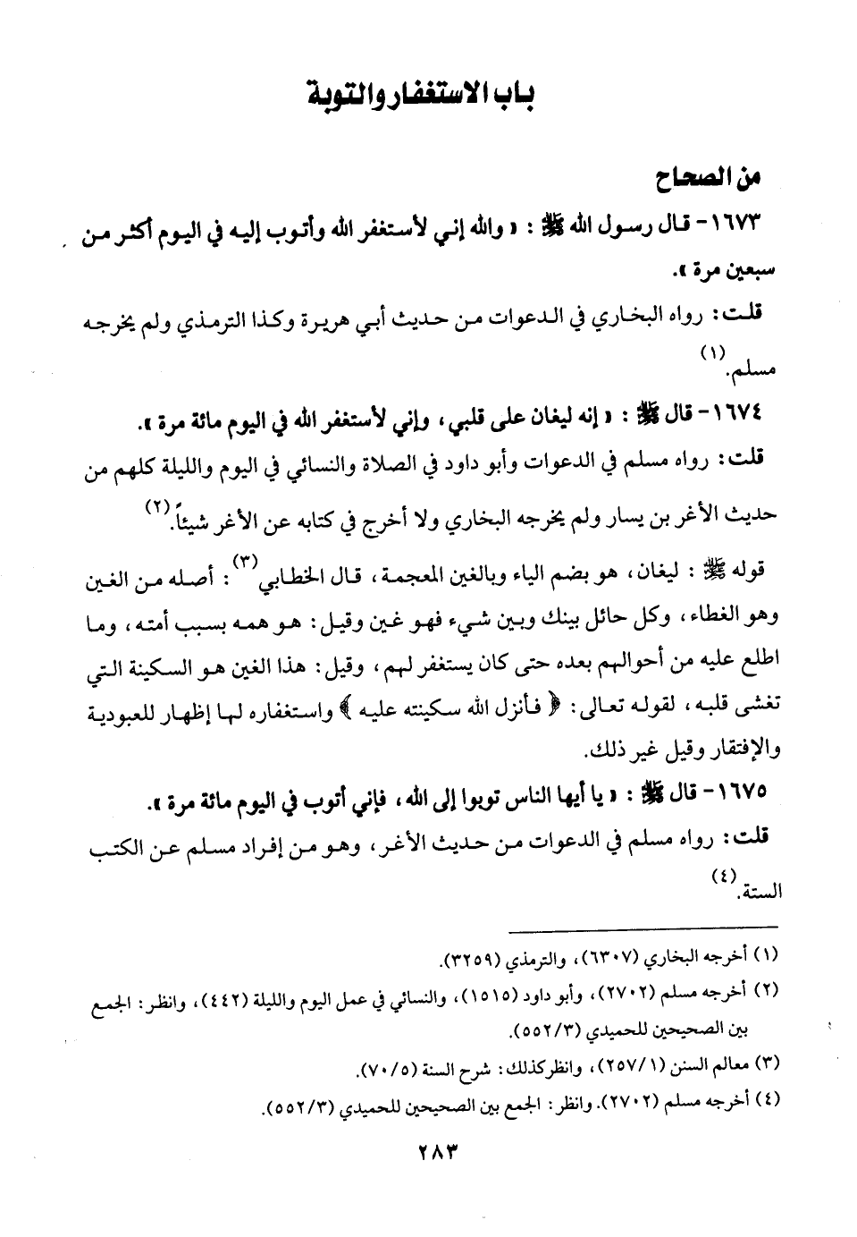 1673 - قال رسول الله -صلى الله عليه وسلم-: "والله إني لأستغفر الله وأتوب إليه في اليوم أكثر من سبعين مرة".
