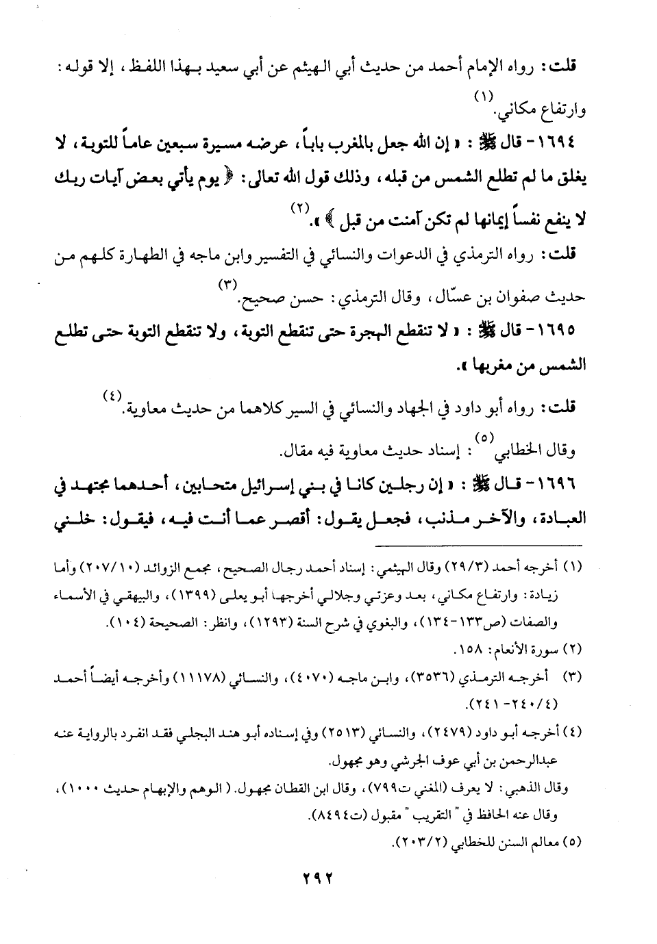 1694 - قال - صلى الله عليه وسلم -: "إن الله جعل بالمغرب بابًا، عرضه مسيرة سبعين عامًا للتوبة، لا يغلق ما لم تطلع الشمس من قبله، وذلك قول الله تعالى: {يَوْمَ يَأْتِي بَعْضُ آيَاتِ رَبِّكَ لَا يَنْفَعُ نَفْسًا إِيمَانُهَا لَمْ تَكُنْ آمَنَتْ مِنْ قَبْلُ} " (¬2).