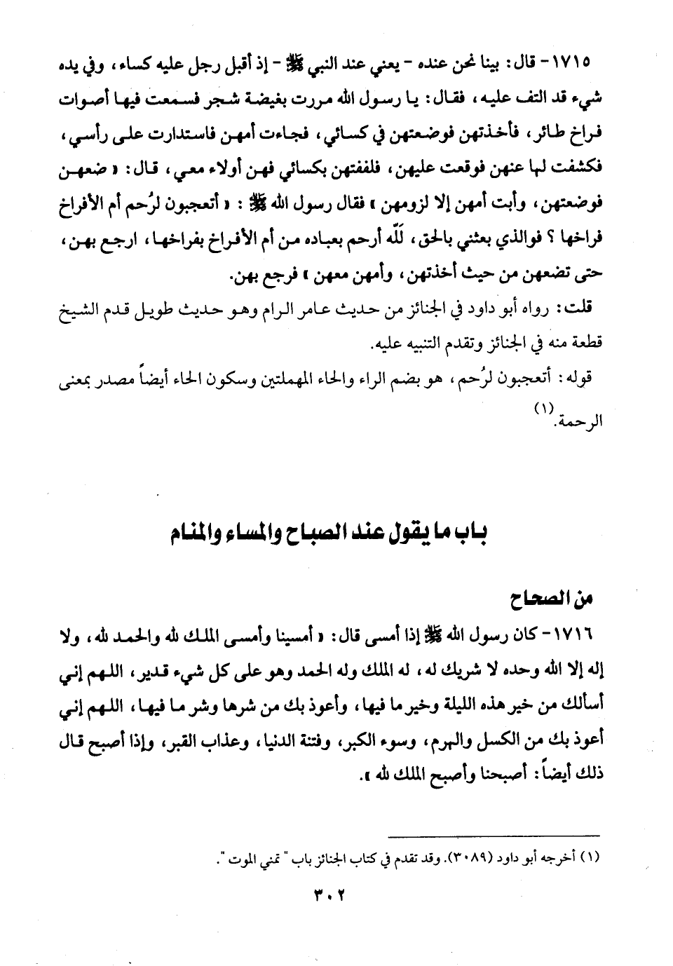 1716 - كان رسول الله - صلى الله عليه وسلم - إذا أمسى قال: "أمسينا وأمسى الملك لله والحمد لله، ولا إله إلا الله وحده لا شريك له، له الملك وله الحمد وهو على كل شيء قدير، اللهم إني أسألك من خير هذه الليلة وخير ما فيها، وأعوذ بك من شرها وشر ما فيها، اللهم إني أعوذ بك من الكسل والهرم، وسوء الكبر، وفتنة الدنيا، وعذاب القبر، وإذا أصبح قال ذلك أيضًا: أصبحنا وأصبح الملك لله".