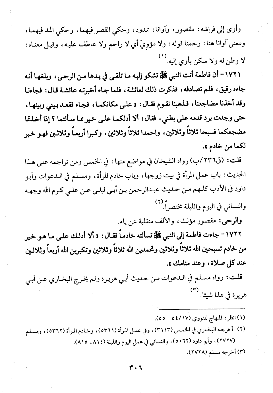 قلت: رواه الشيخان في مواضع منها: في الخمس ومن تراجمه على هذا الحديث: باب عمل المرأة في بيت زوجها، وباب خادم المرأة، ومسلم في الدعوات وأبو داود في الأدب كلهم من حديث عبد الرحمن بن أبي ليلى عن علي كرم الله وجهه والنسائي في اليوم والليلة مختصرًا. (¬2)