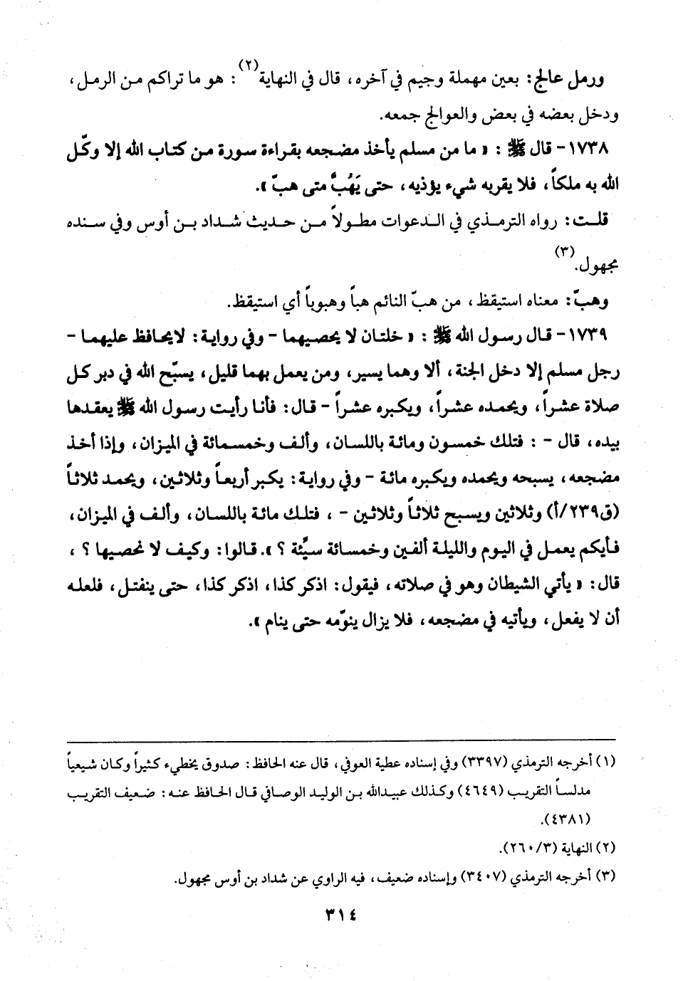 1739 - قال رسول الله - صلى الله عليه وسلم -: "خلتان لا يحصيهما -وفي رواية: لا يحافظ عليهما- رجل مسلم إلا دخل الجنة، ألا وهما يسير، ومن يعمل بهما قليل، يسبّح الله في دبر كل صلاة عشرًا، ويحمده عشرًا، ويكبره عشرًا -قال: فأنا رأيت رسول الله - صلى الله عليه وسلم - يعقدها بيده، قال-: فتلك خمسون ومائة باللسان، وألف وخمسمائة في الميزان، وإذا أخذ مضجعه، يسبحه ويحمده ويكبره مائة -وفي رواية: يكبر أربعًا وثلاثين، ويحمد ثلاثًا وثلاثين ويسبح ثلاثًا وثلاثين-، فتلك مائة باللسان، وألف في الميزان، فأيكم يعمل في اليوم والليلة ألفين وخمسائة سيِّئة؟ ". قالوا: وكيف لا نحصيها؟، قال: "يأتي الشيطان وهو في صلاته، فيقول: اذكر كذا، اذكر كذا، حتى ينفتل، فلعله أن لا يفعل، ويأتيه في مضجعه، فلا يزال ينّومه حتى ينام".