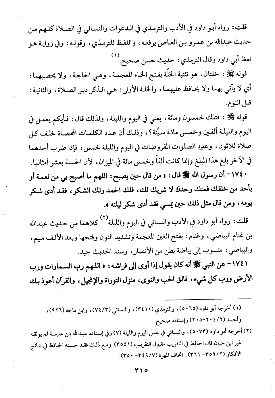 (¬2) أخرجه أبو داود (5073) , والنسائي في عمل اليوم والليلة (7) وفي إسناده عبد الله بن عنبسة لم يوثقه غير ابن حبان قال الحافظ في التقريب مقبول التقريب (3541). ومع ذلك فقد حسنه الحافظ في نتائج الأفكار (2/ 359 - 361)، إتحاف المهرة (7/ 349 - 350).