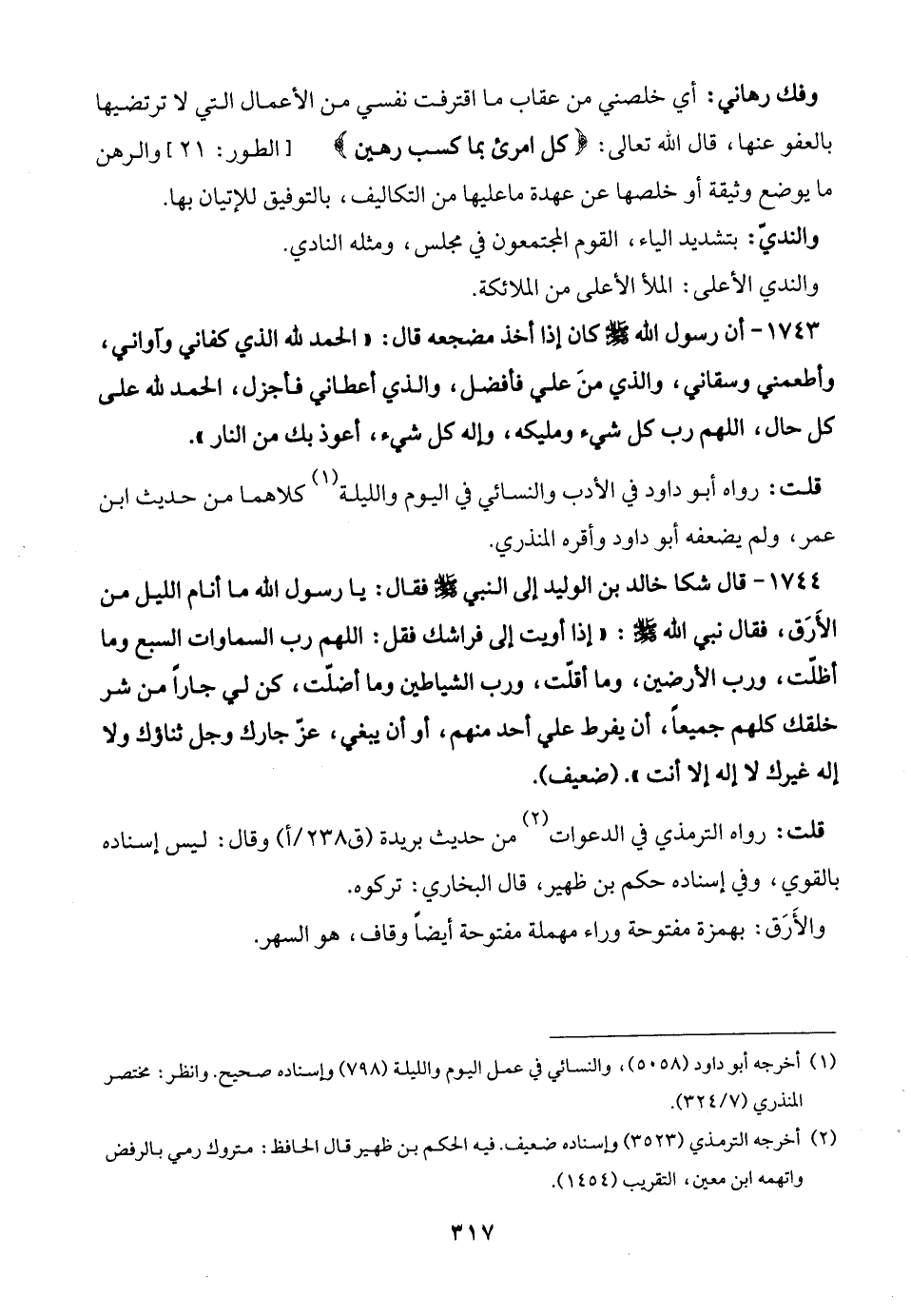 1744 - قال شكا خالد بن الوليد إلى النبي - صلى الله عليه وسلم - فقال: يا رسول الله ما أنام الليل من الأَرَق، فقال نبي الله - صلى الله عليه وسلم -: "إذا أويت إلى فراشك فقل: اللهم رب السماوات السبع وما أظلّت، ورب الأرضين، وما أقلّت، ورب الشياطين وما أضلّت، كن لي جارًا من شر خلقك كلهم جميعًا، أن يفرط علي أحد منهم، أو أن يبغي، عزّ جارك وجل ثناؤك ولا إله غيرك لا إله إلا أنت". (ضعيف).