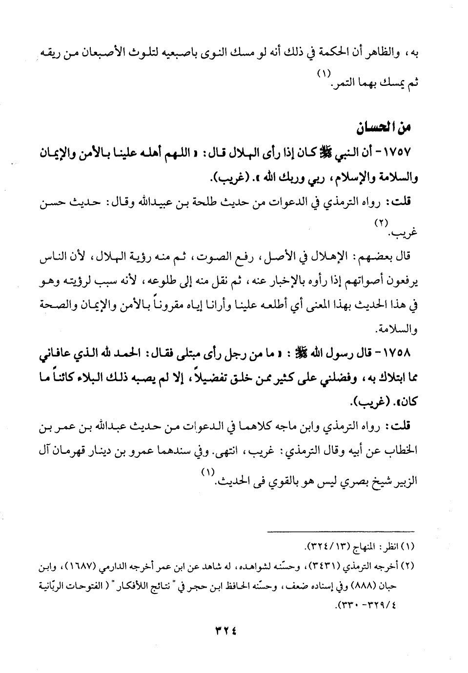 1758 - قال رسول الله - صلى الله عليه وسلم -: "ما من رجل رأى مبتلى فقال: الحمد لله الذي عافاني مما ابتلاك به، وفضلني على كثير ممن خلق تفضيلًا، إلا لم يصبه ذلك البلاء كائنًا ما كان". (غريب).