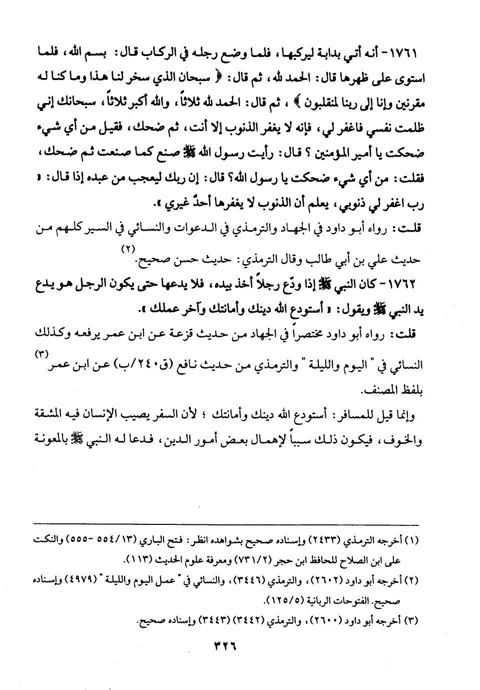 1761 - أنه أتي بدابة ليركبها، فلما وضع رجله في الركاب قال: بسم الله، فلما استوى على ظهرها قال: الحمد لله، ثم قال: {سُبْحَانَ الَّذِي سَخَّرَ لَنَا هَذَا وَمَا كُنَّا لَهُ مُقْرِنِينَ (13) وَإِنَّا إِلَى رَبِّنَا لَمُنْقَلِبُونَ}، ثم قال: الحمد لله ثلاثًا، والله أكبر ثلاثًا، سبحانك إني ظلمت نفسي فاغفر لي، فإنه لا يغفر الذنوب إلا أنت، ثم ضحك، فقيل من أي شيء ضحكت يا أمير المؤمنين؟ قال: رأيت رسول الله - صلى الله عليه وسلم - صنع كما صنعت ثم ضحك، فقلت: من أي شيء ضحكت يا رسول الله؟ قال: إن ربك ليعجب من عبده إذا قال: "رب اغفر لي ذنوبي، يعلم أن الذنوب لا يغفرها أحدٌ غيري".
