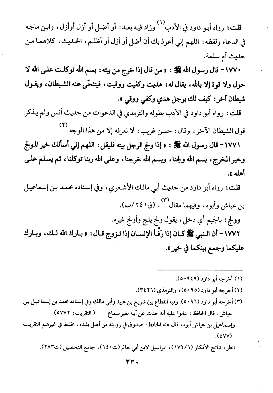 1770 - قال رسول الله - صلى الله عليه وسلم -: "من قال إذا خرج من بيته: بسم الله توكلت على الله لا حول ولا قوة إلا بالله، يقال له: هديت وكفيت ووقيت، فيتنحّى عنه الشيطان، ويقول شيطان آخر: كيف لك برجل هدي وكفي ووقي".