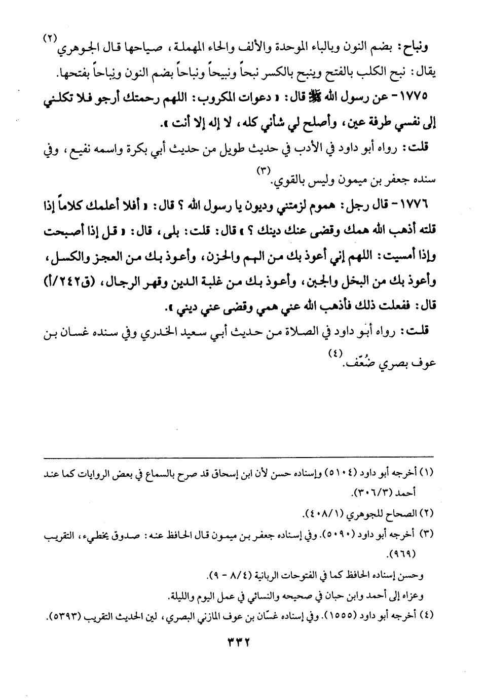 1776 - قال رجل: هموم لزمتني وديون يا رسول الله؟ فال: "أفلا أعلمك كلامًا إذا قلته أذهب الله همك وقضى عنك دينك؟ " قال: قلت: بلى، قال: "قل إذا أصبحت وإذا أمسيت: اللهم إني أعوذ بك من الهم والحزن، وأعوذ بك من العجز والكسل، وأعوذ بك من البخل والجبن، وأعوذ بك من غلبة الدين وقهر الرجال، قال: ففعلت ذلك فأذهب الله عني همي وقضى عني ديني".