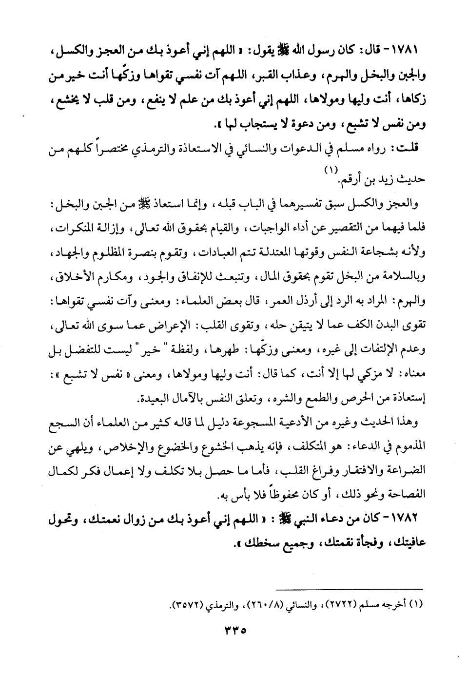 1781 - قال: كان رسول الله - صلى الله عليه وسلم - يقول: "اللهم إني أعوذ بك من العجز والكسل، والجبن والبخل والهرم، وعذاب القبر، اللهم آت نفسي تقواها وزكها أنت خير من زكاها، أنت وليها ومولاها، اللهم إني أعوذ بك من علم لا ينفع، ومن قلب لا يخشع، ومن نفس لا تشبع، ومن دعوة لا يستجاب لها".