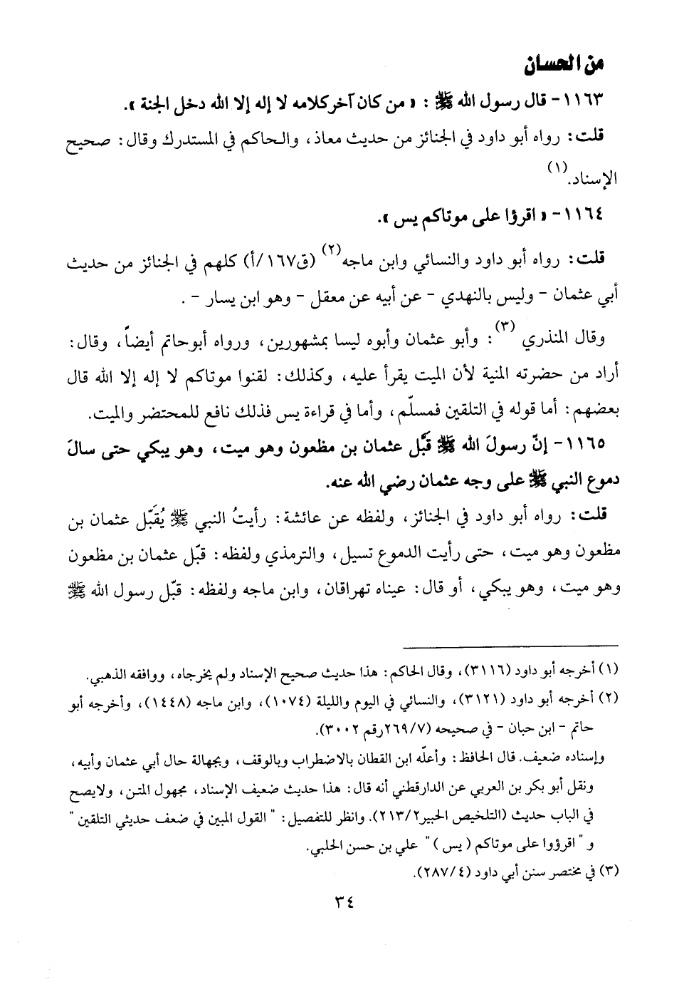 1165 - إنّ رسولَ الله - صلى الله عليه وسلم - قبَّل عثمان بن مظعون وهو ميت، وهو يبكي حتى سالَ دموع النبي - صلى الله عليه وسلم - على وجه عثمان رضي الله عنه.
