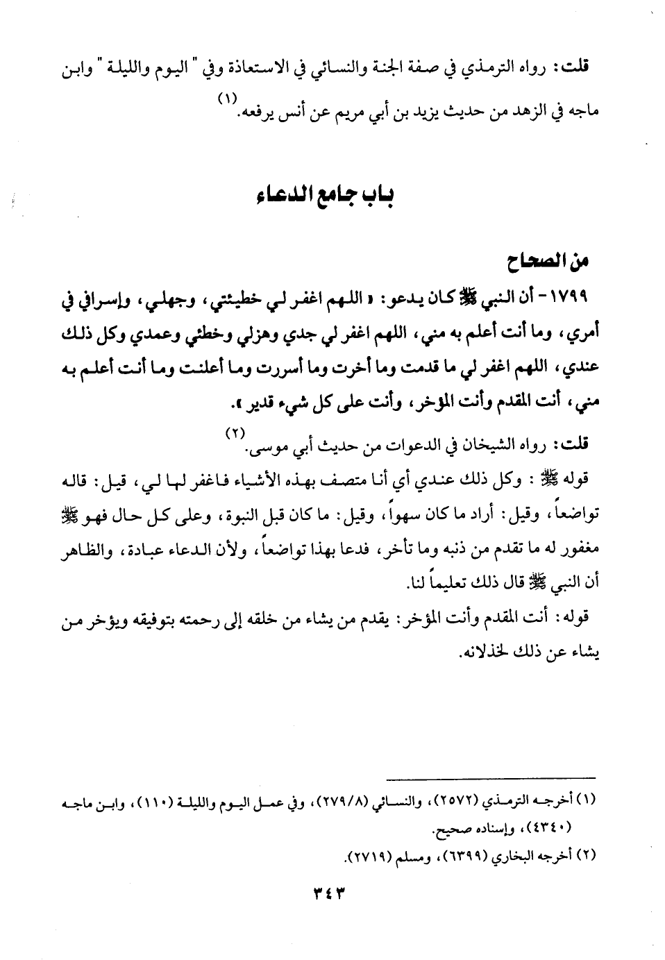 1799 - أن النبي - صلى الله عليه وسلم - كان يدعو: "اللهم اغفر لي خطيئتي، وجهلي، وإسرافي في أمري، وما أنت أعلم به مني، اللهم اغفر لي جدي وهزلي وخطئي وعمدي وكل ذلك عندي، اللهم اغفر لي ما قدمت وما أخرت وما أسررت وما أعلنت وما أنت أعلم به مني، أنت المقدم وأنت المؤخر، وأنت على كل شيء قدير".